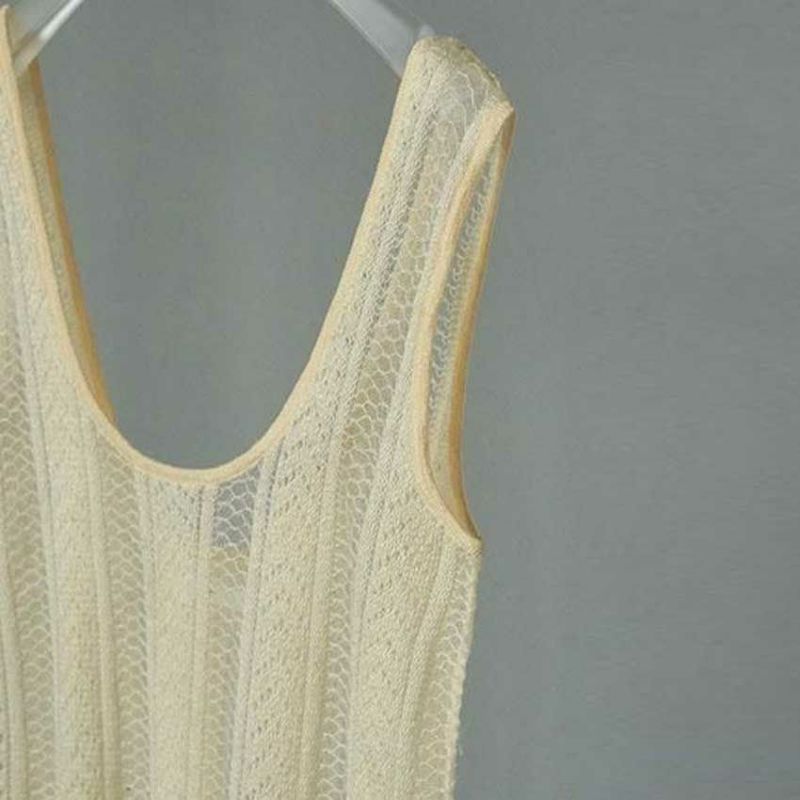 Uネックデザインで、後ろの方が少し深めに開いています。透け感があるので、お手持ちのペチコート等と合わせたり、パンツとのレイヤードスタイルがおすすめです。