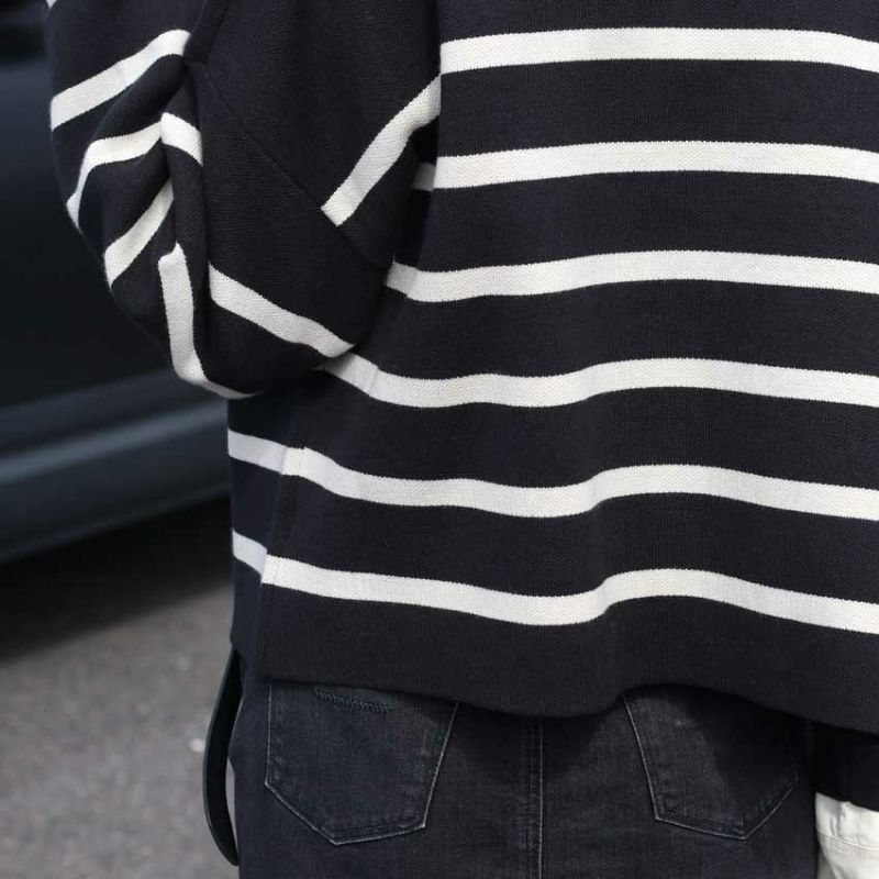 注目は、ボーダーのリズムを崩さず配置されたブランドロゴパッチ。