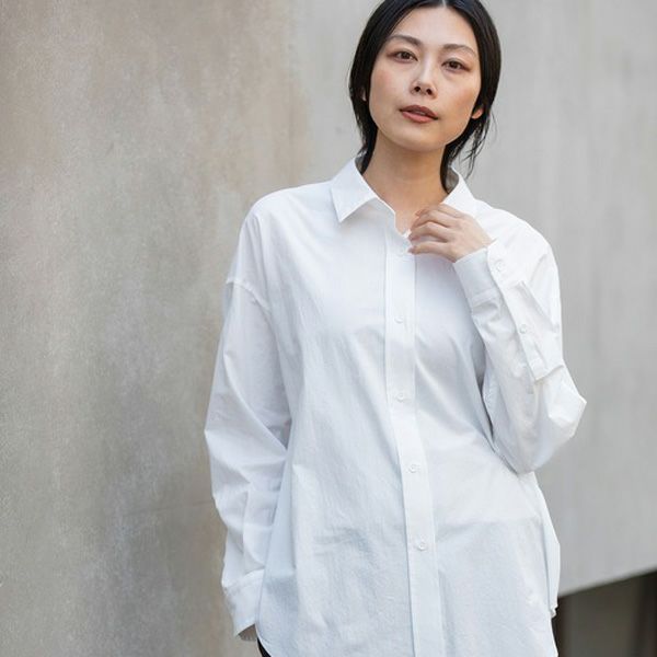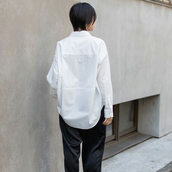 後ろの身巾をたっぷりとって展開したパターンにより、立体的で丸みのある女性らしいバックスタイルに仕立てたシンプルなレギュラーカラーシャツです。