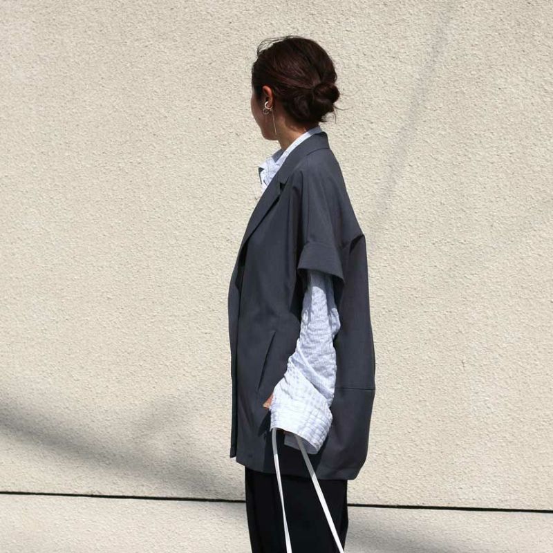エアリーな質感と着心地、対照的なテーラードのきちんと感が魅力の半袖ジャケット。