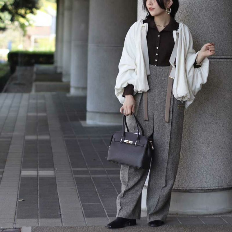 通年着られる程よい厚みの素材で、ニットからブラウスまで幅広くコーディネート可能。