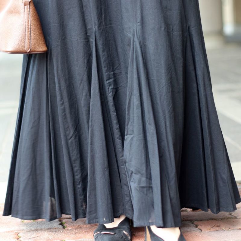 シンプルながらも、動くたび揺れるたっぷりの裾が上品で印象的。