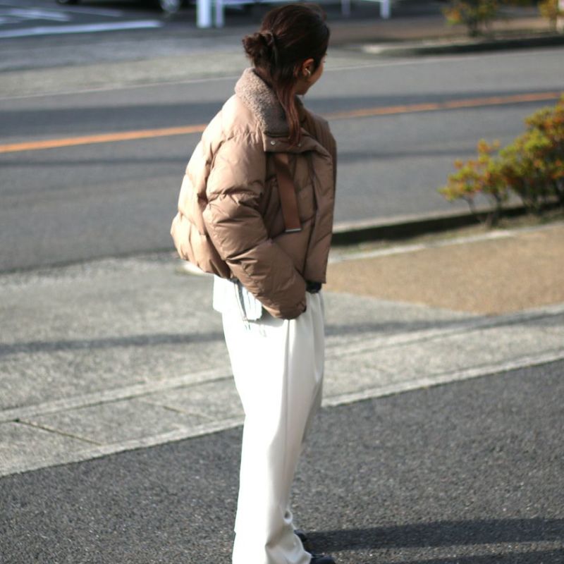 カジュアルになりがちなダウンに、女性らしい華やかさをプラスしています。