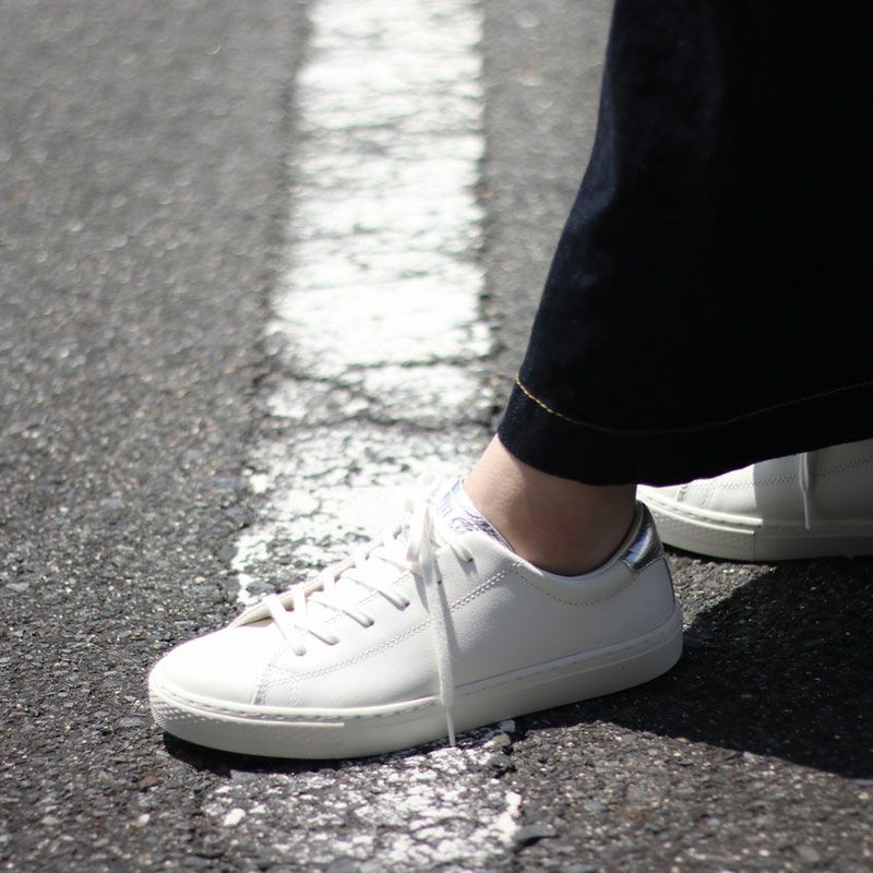 シンプルなホワイトアッパーに、シルバーのグレインレザーをタンとバックチップにポイント使いしたアイテム。