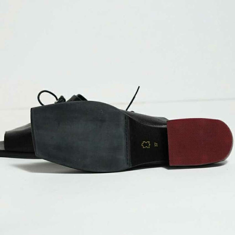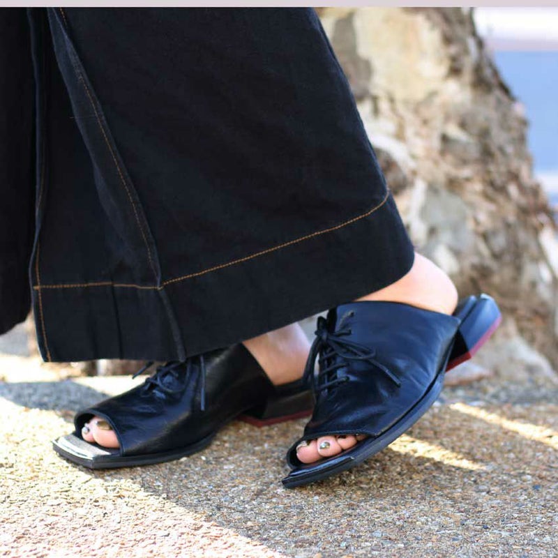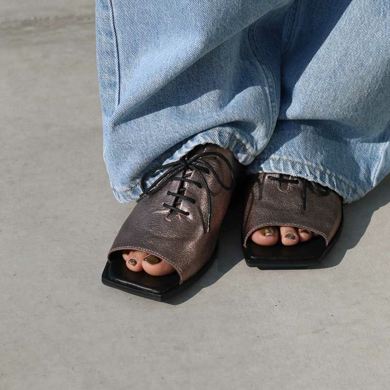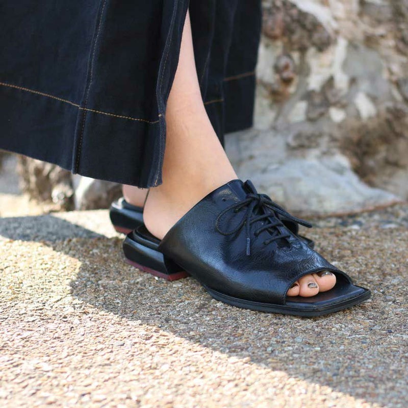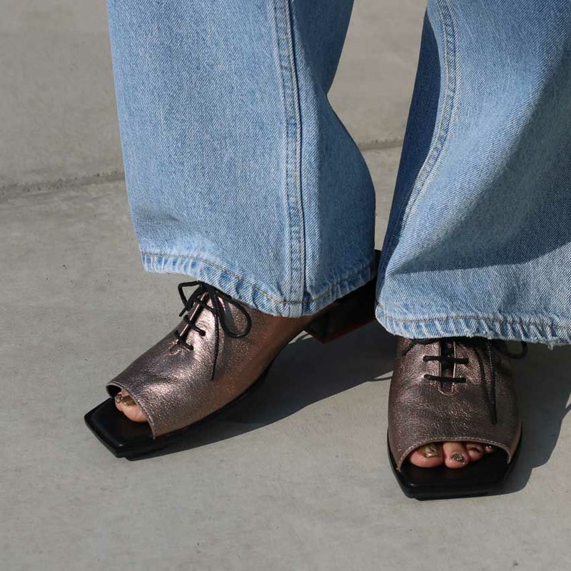 レースアップの女性らしいデザイン性とかかとにあしらわれたバイカラーのウッドがアクセントになったスパイシーなレザーサンダル。