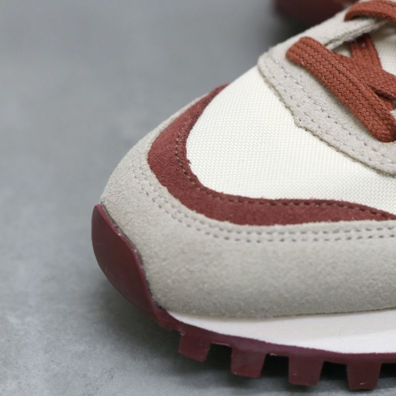 アイボリーとグレーをベースにボルドーをアクセントにミックスした配色は、トレンド感のある“レトロさ”をしっかりと感じさせる高い感度をもつ大人な1足となっています。
