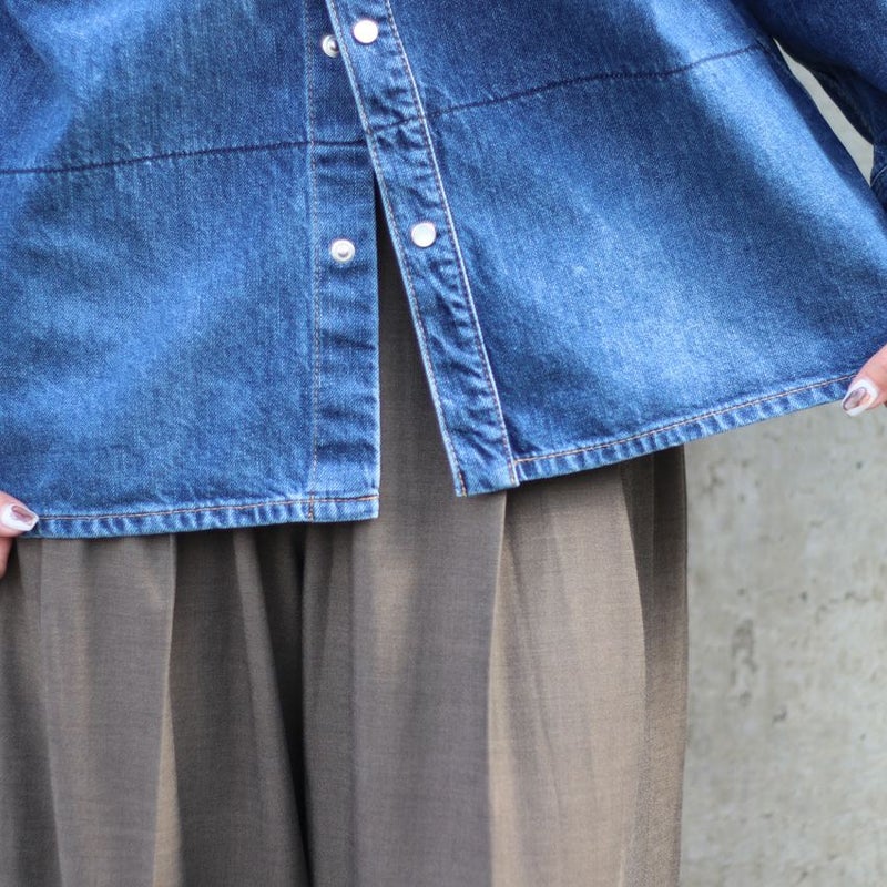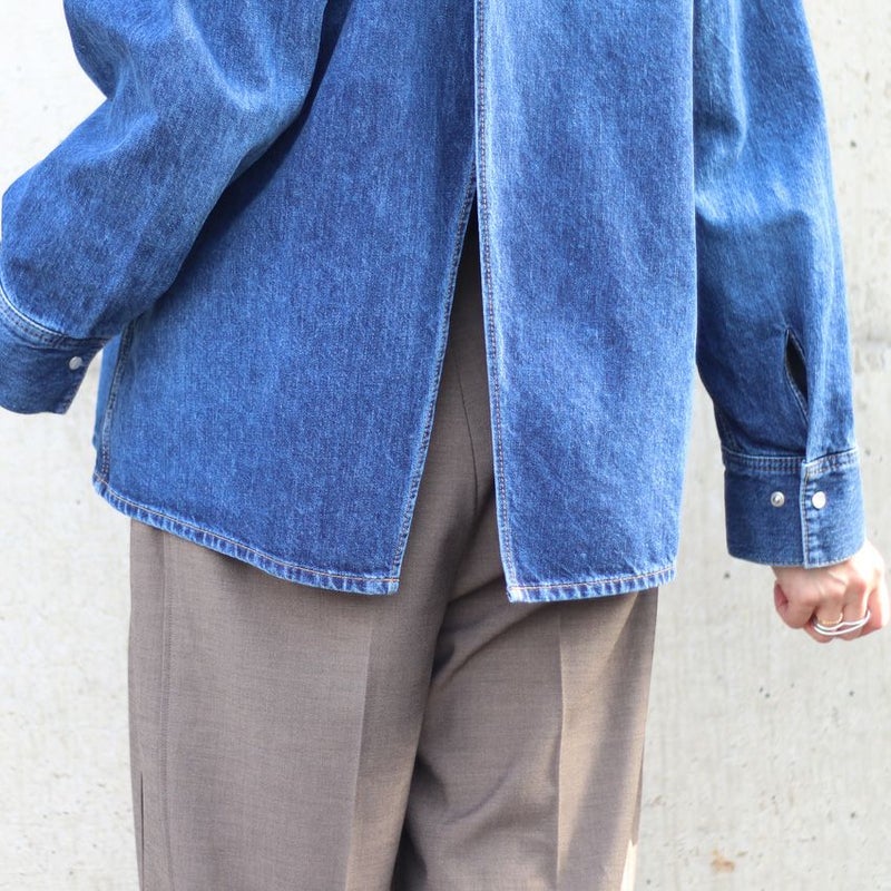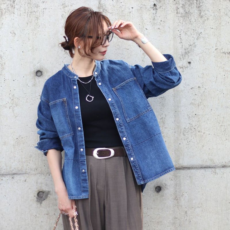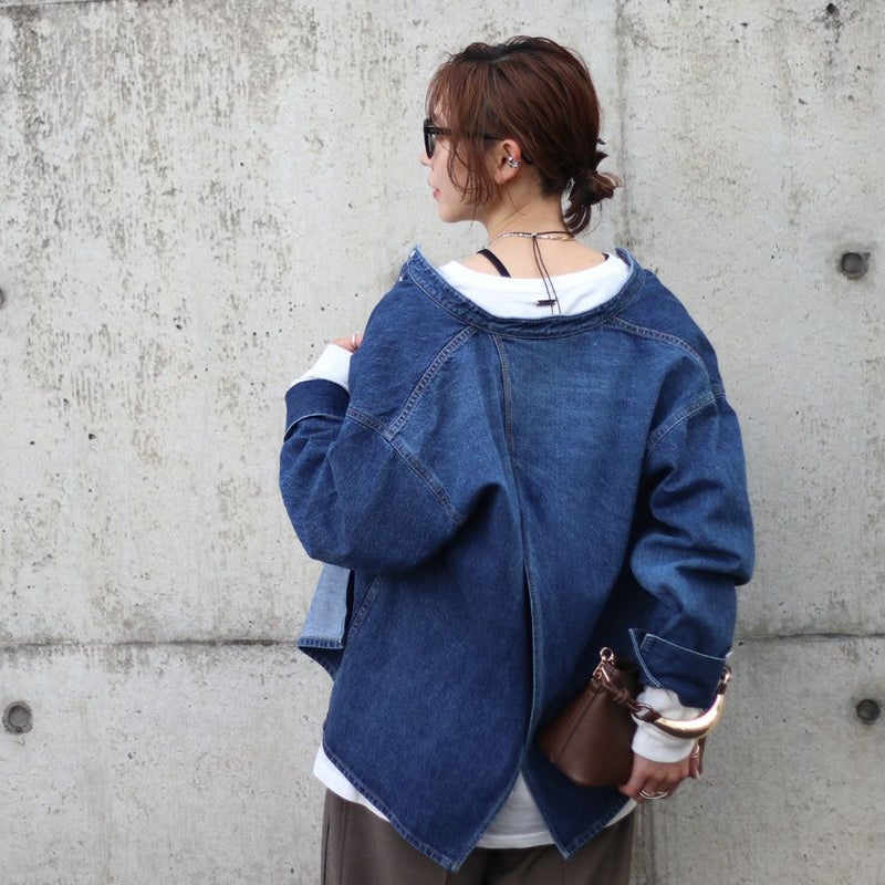 型崩れしないデニムシャツブルゾンは、抜き襟にして着用すると立体感が出るのでオススメです。