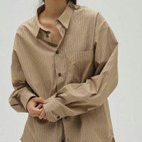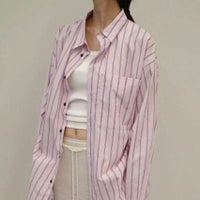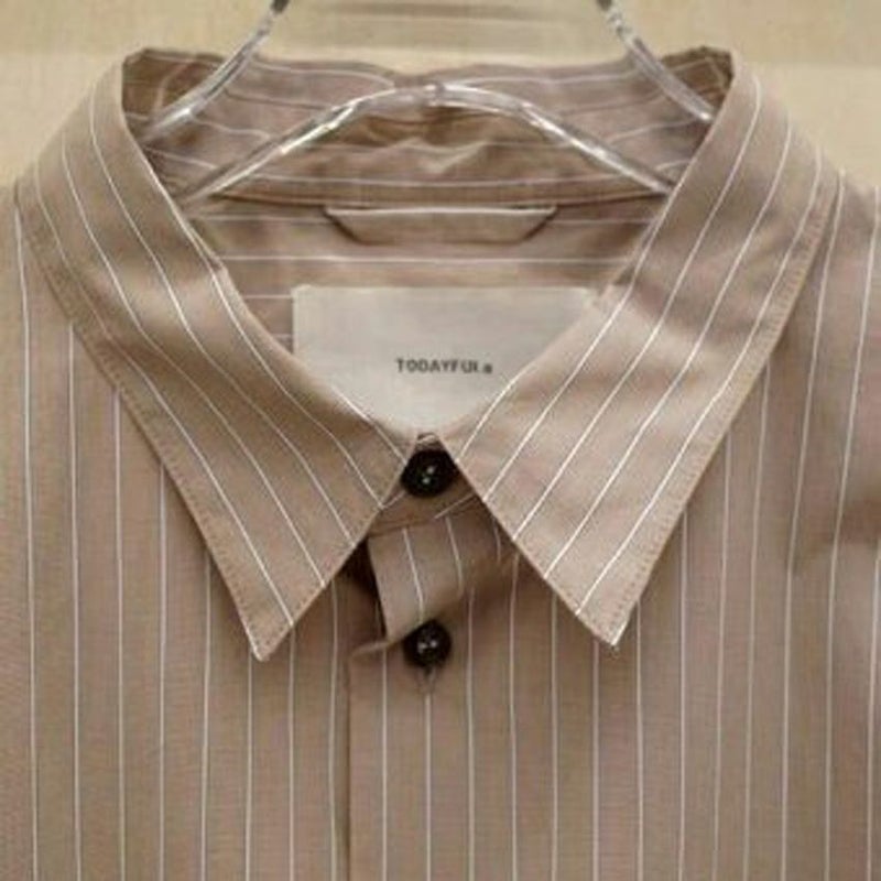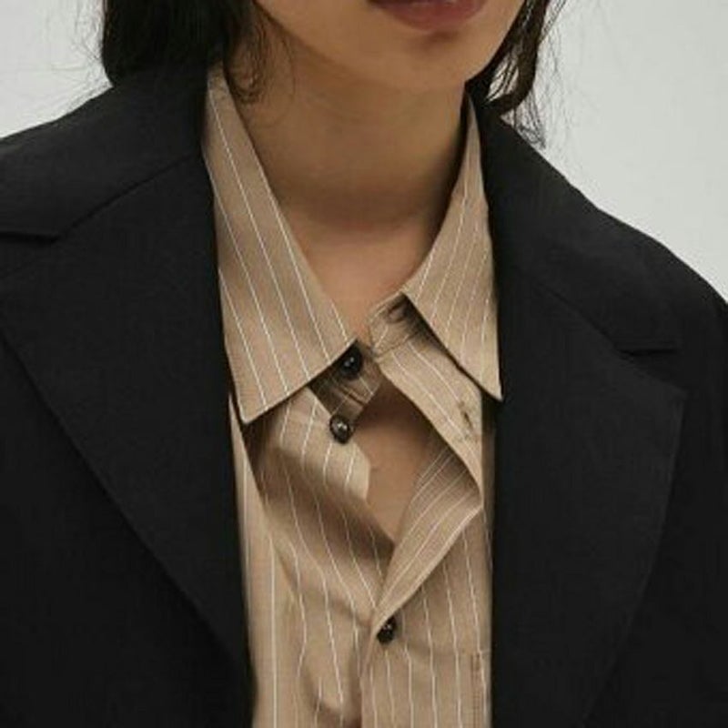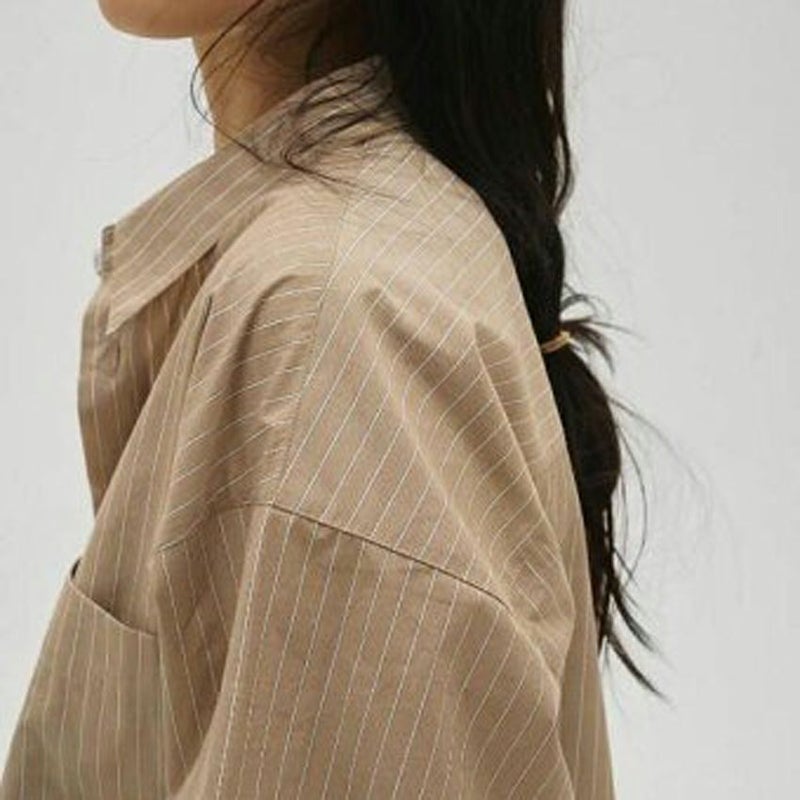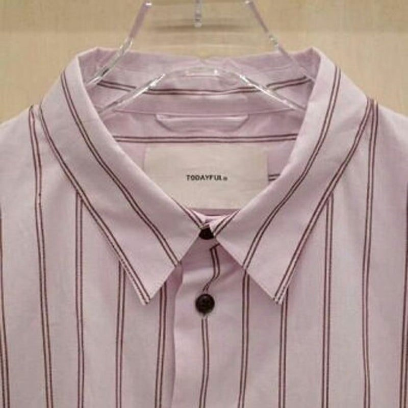 カラーごとに異なるストライプのピッチがアクセントになり、胸元のポケットや配色ボタンがさりげないポイントです。