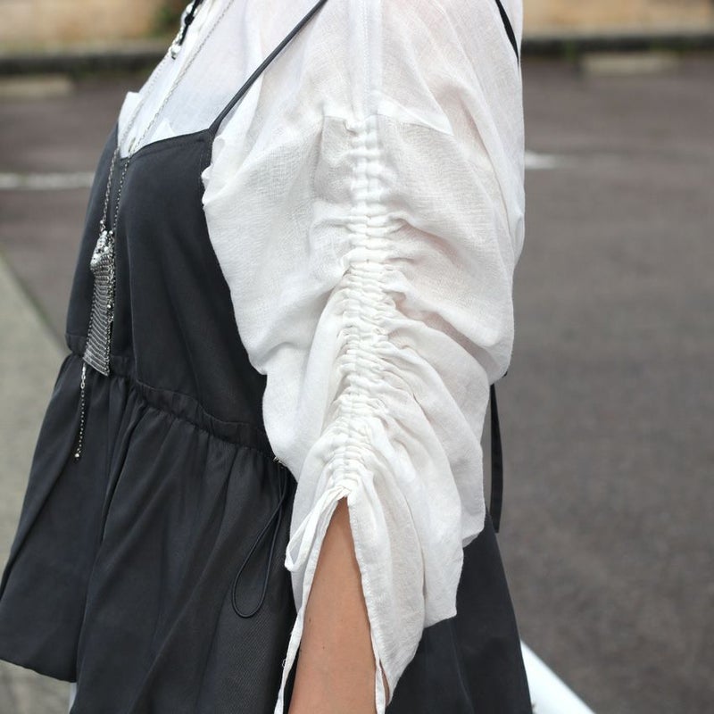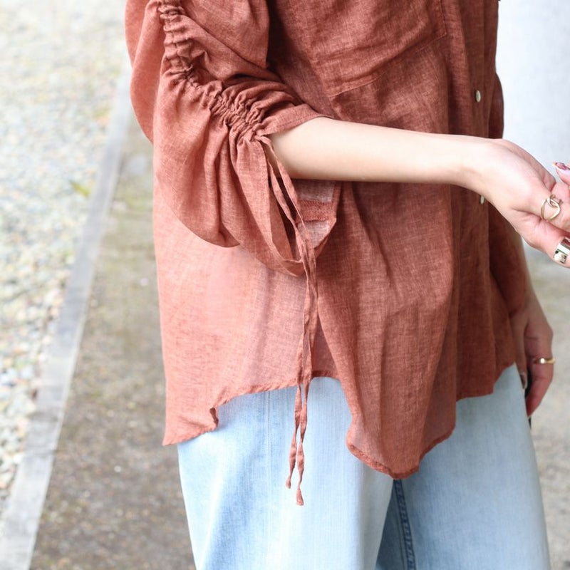 袖にはシャーリングデザインを施していますので、そのままでも袖を絞ってたくし上げてもかわいいデザインになっています。