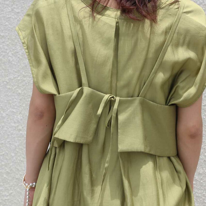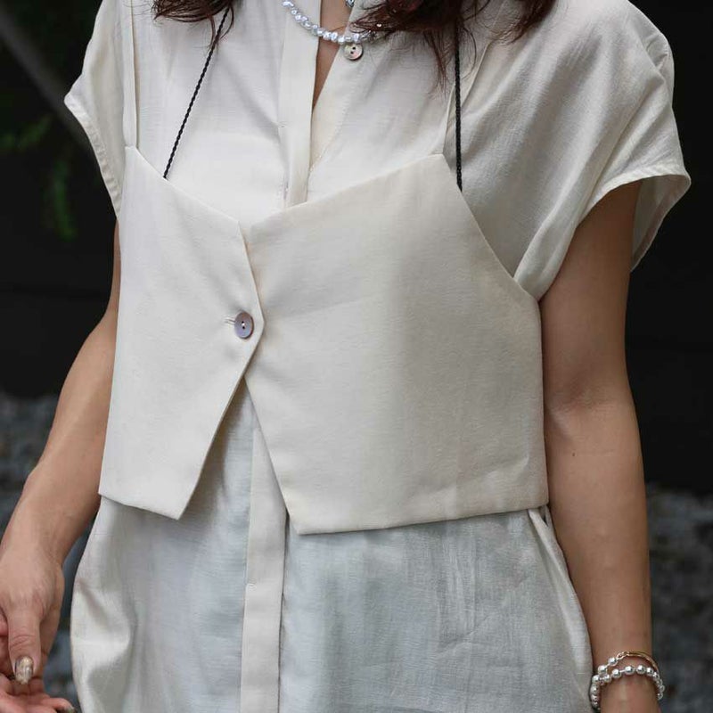 ビスチェは、ベストライクなボタンディテールがポイント。バックスタイルはリボンで軽やかに仕上げ、ラフに羽織るだけでこなれ感を演出してくれます。