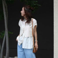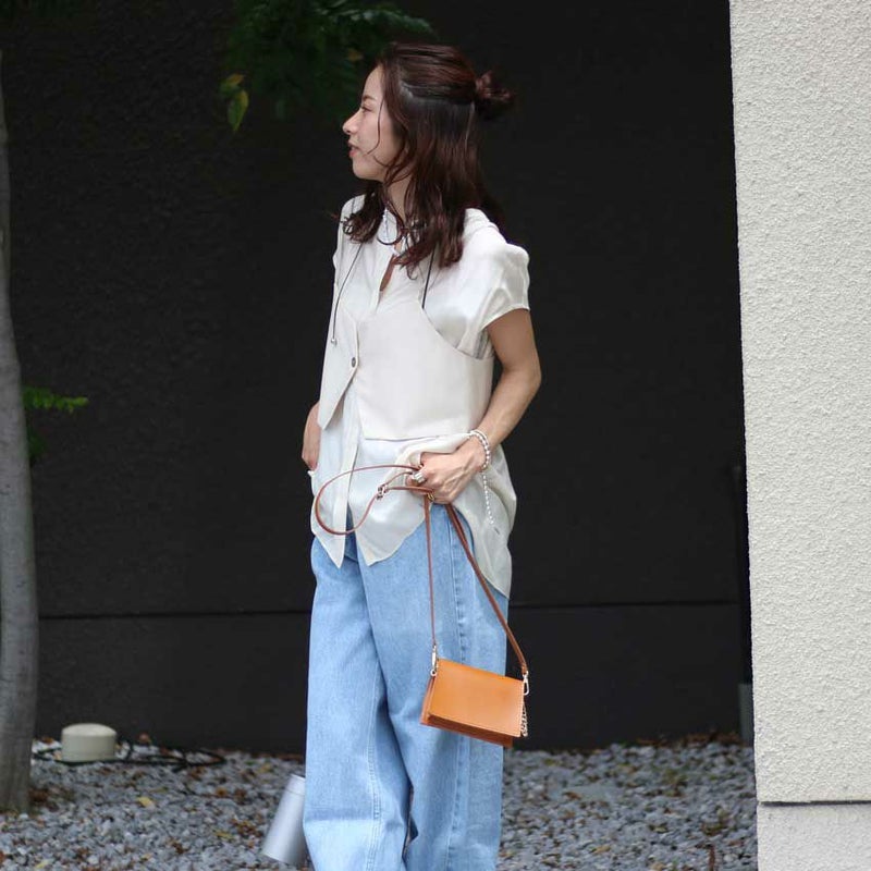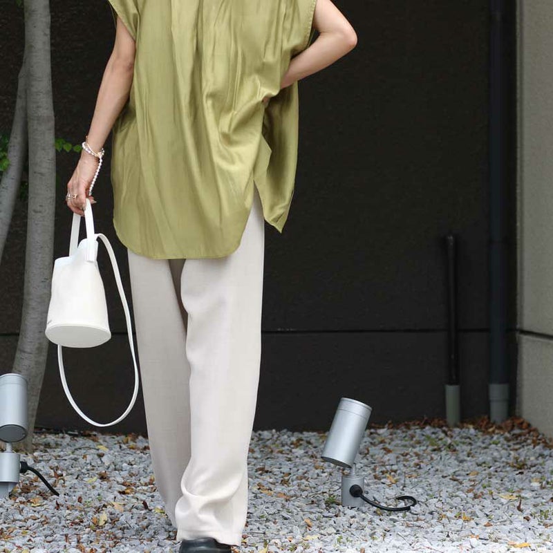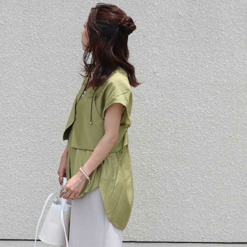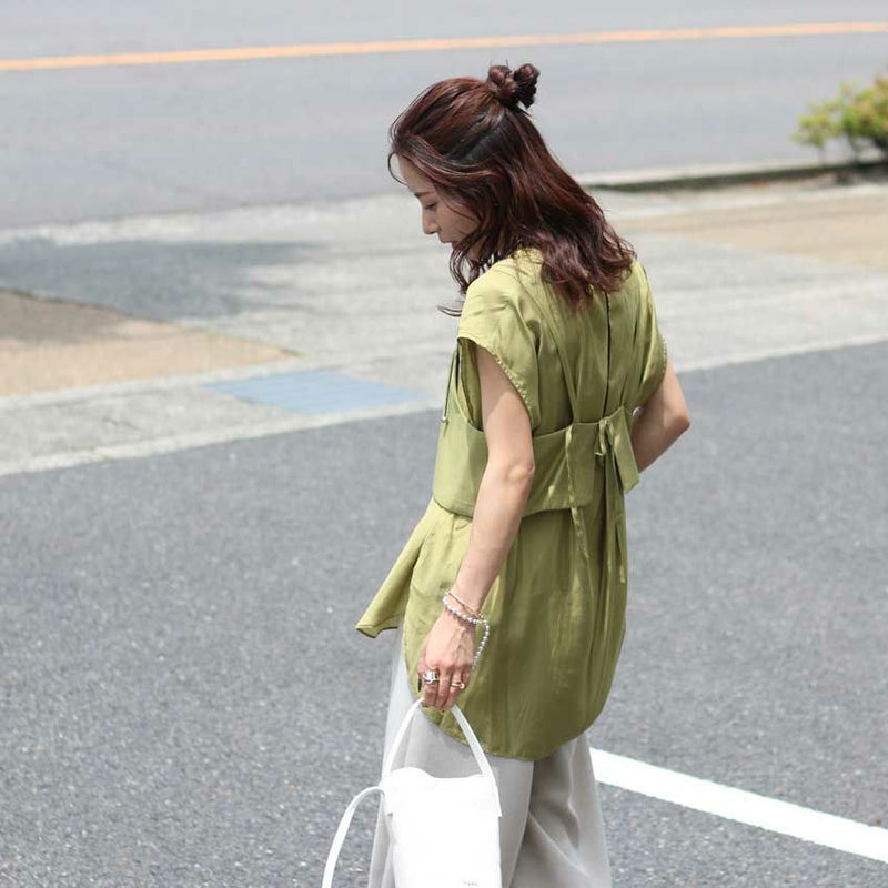 シャツは比翼仕立ての上品なフレンチスリーブで、どんなボトムとも好相性。きれいめにもカジュアルにも着こなせる万能デザインです。