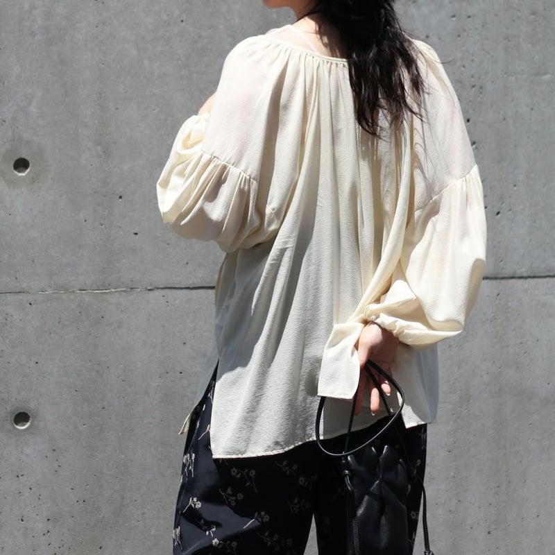 上品なシボ感のあるジョーゼット風素材を使用した、たっぷりタック&ギャザーが目を引くボリュームブラウス。