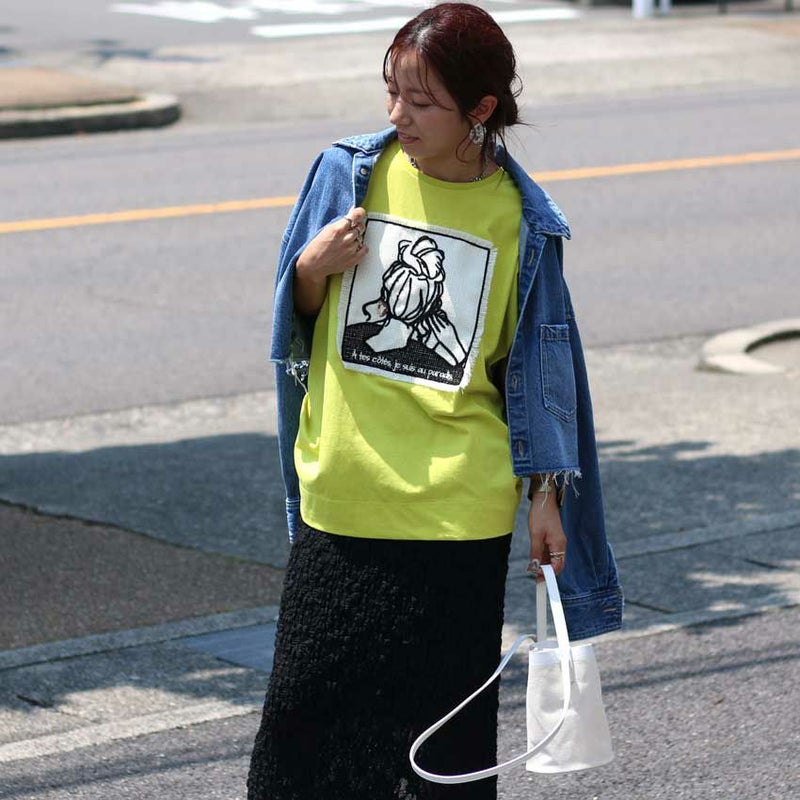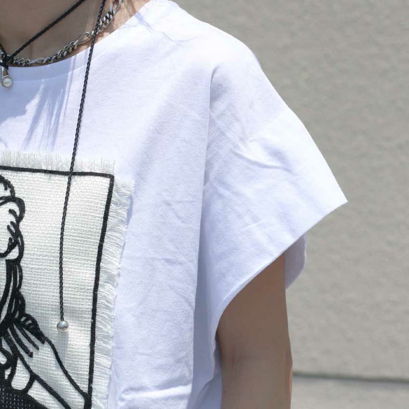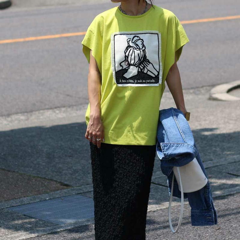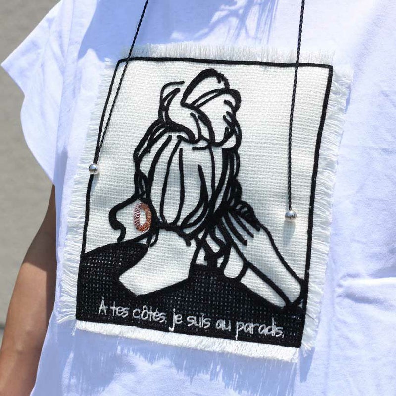 刺繍で描かれた“後ろを向いた女性”のデザインが印象的な、アートのような一枚。