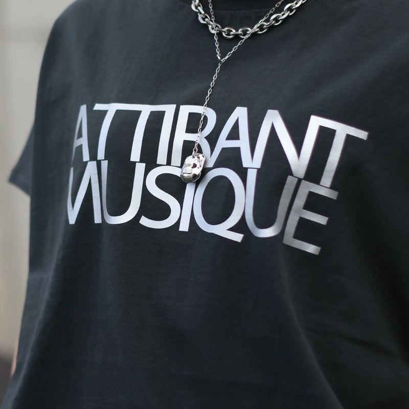 前身頃には、モードな雰囲気漂う英字ロゴを光沢感のある箔押しでプリントし、さりげなく華やかさをプラス。