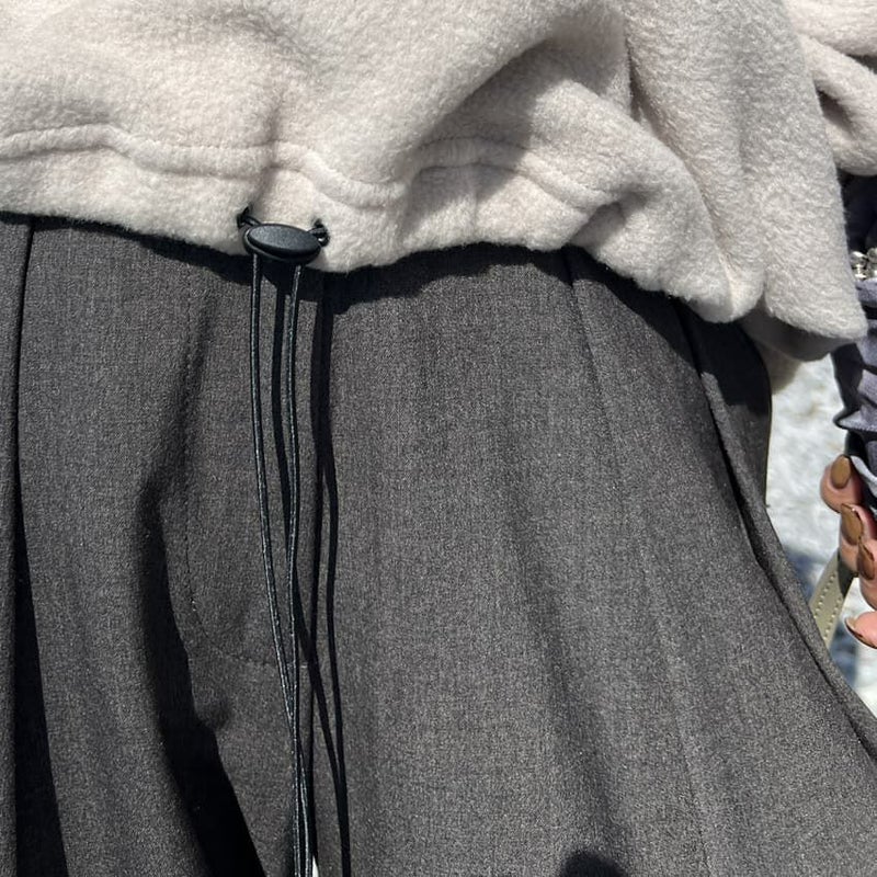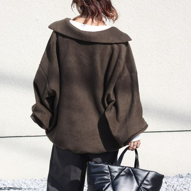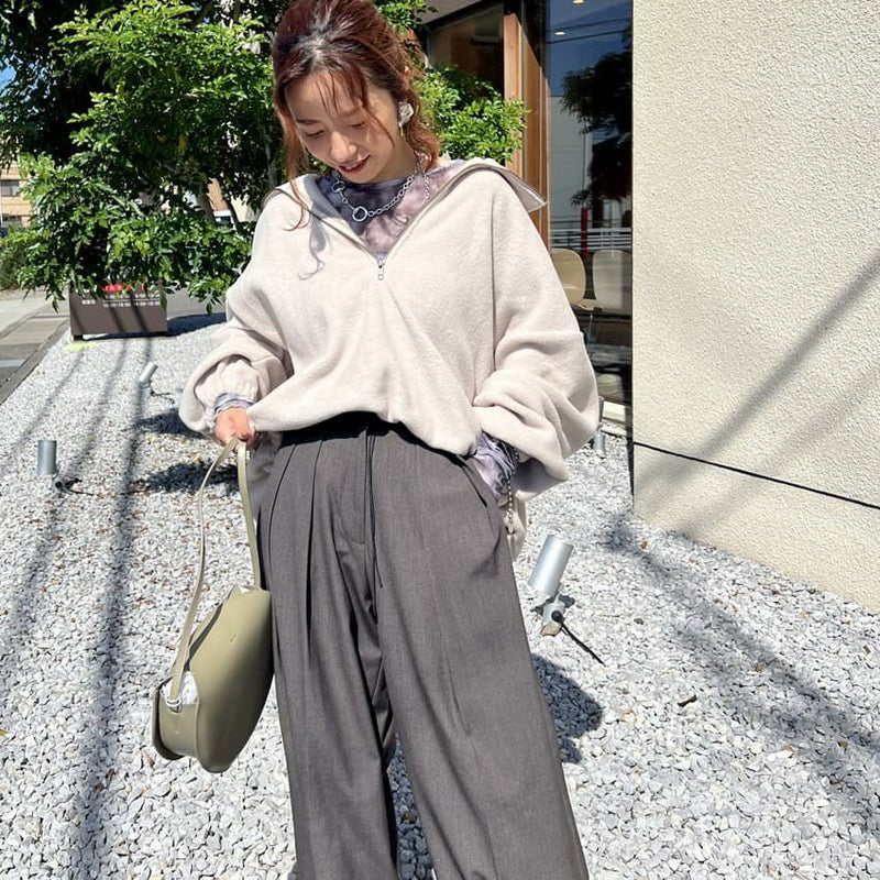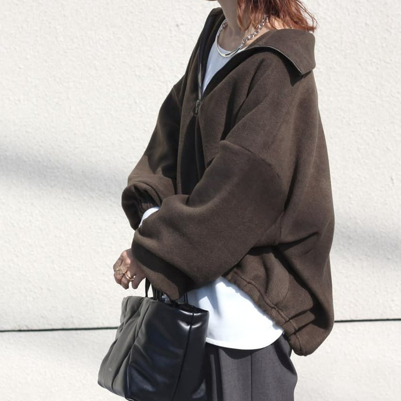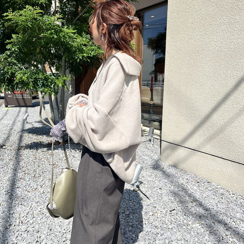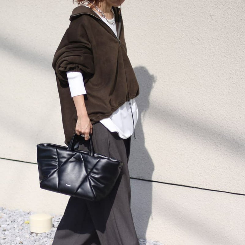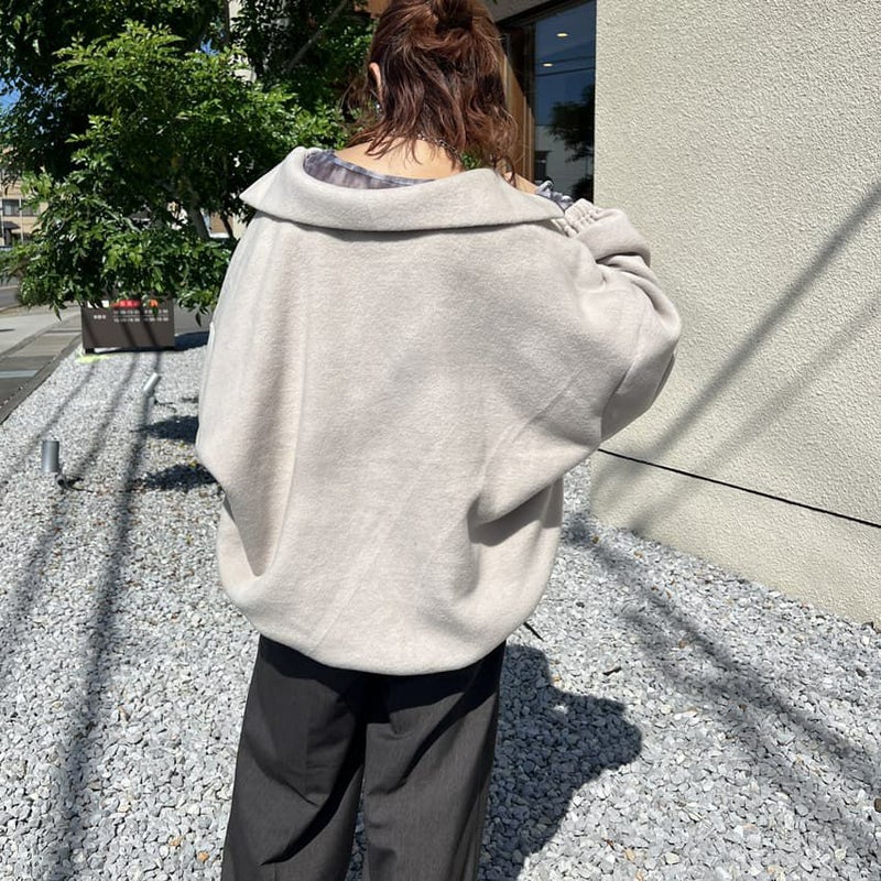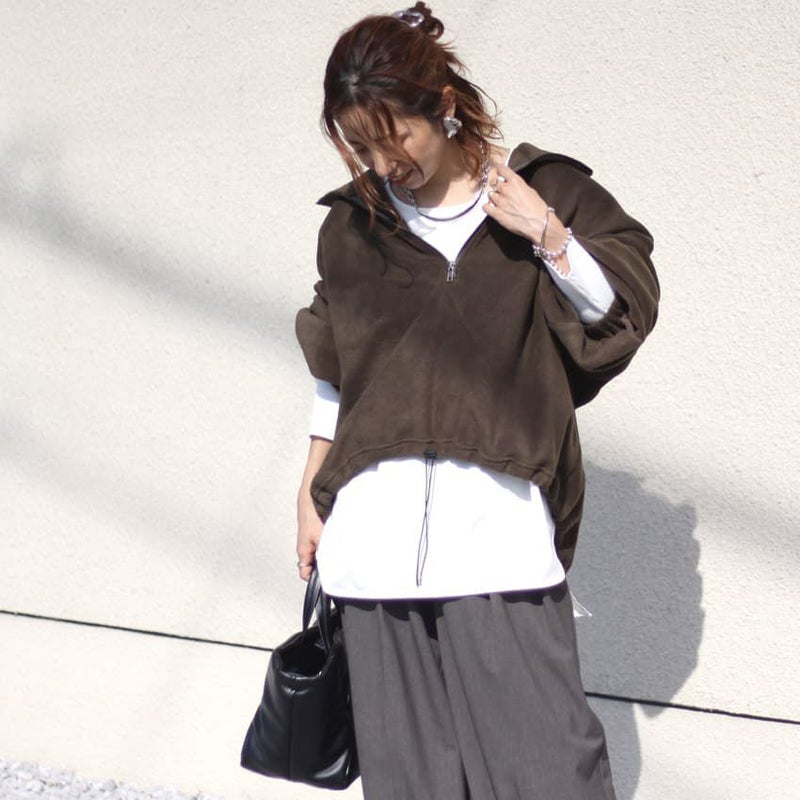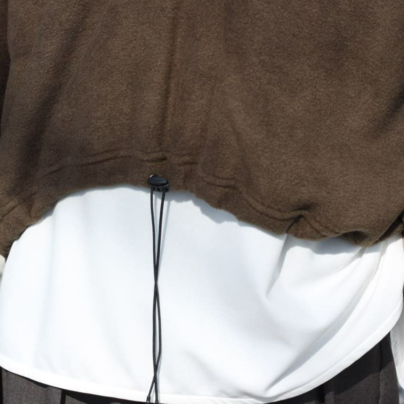オーバーサイズのゆったりした作りで、デザインもシンプルながら、ボリュームスリーブだったり、裾のドローコードで絞りを掛けれたり、コーデに合わせてアレンジの効く一着。
