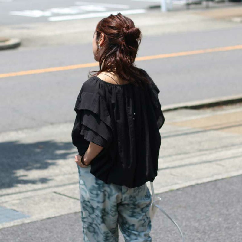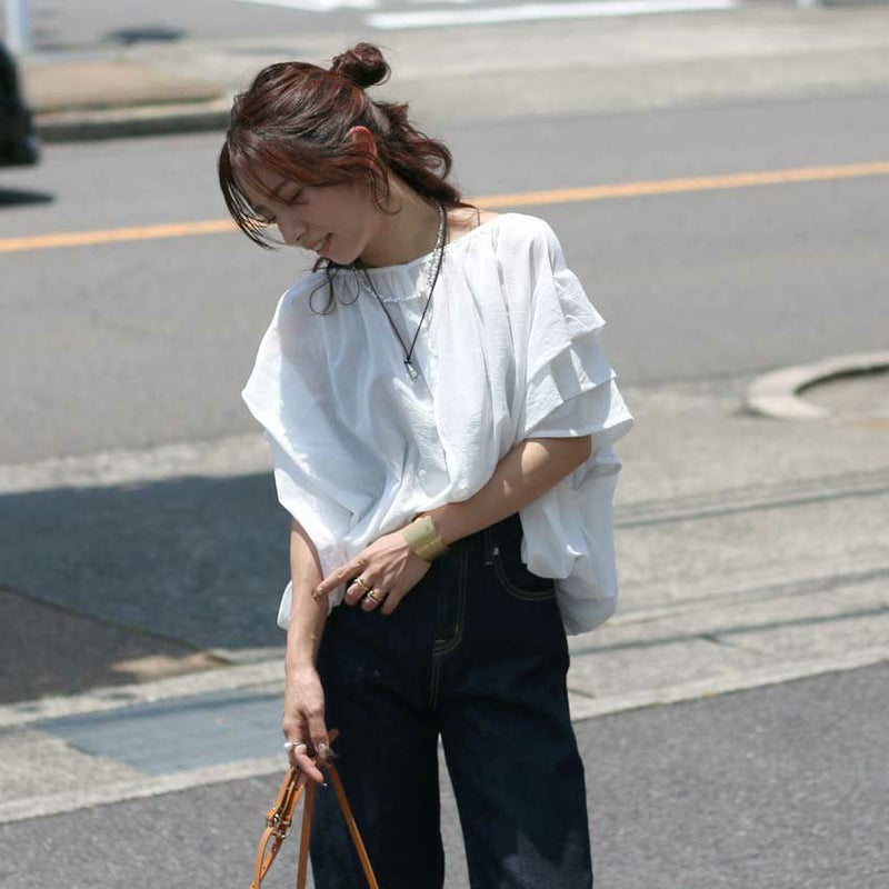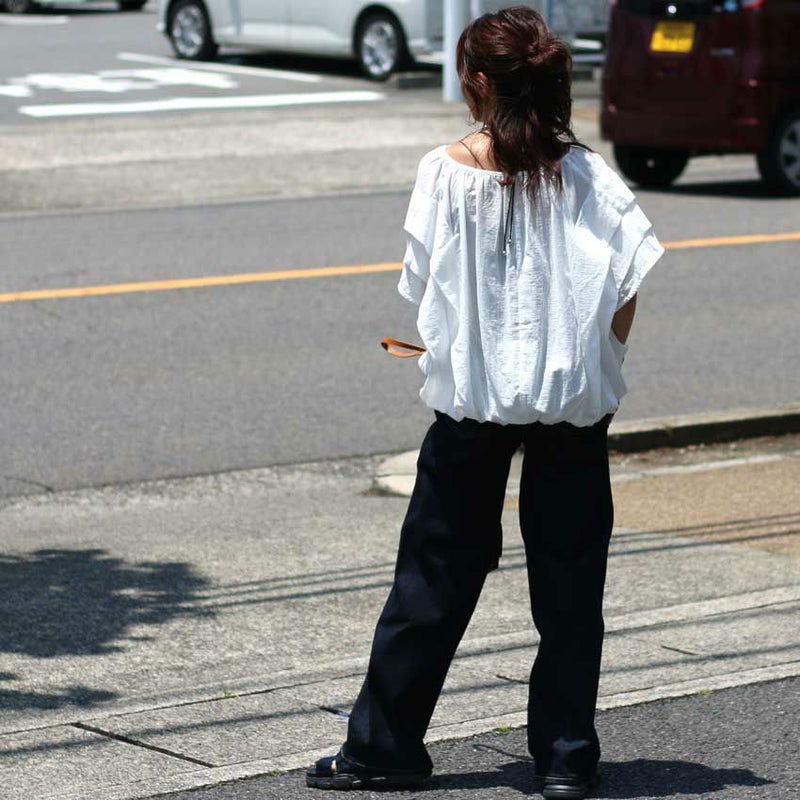 ワイドパンツやスカート、デニム何でも合わせられる万能ブラウスです。