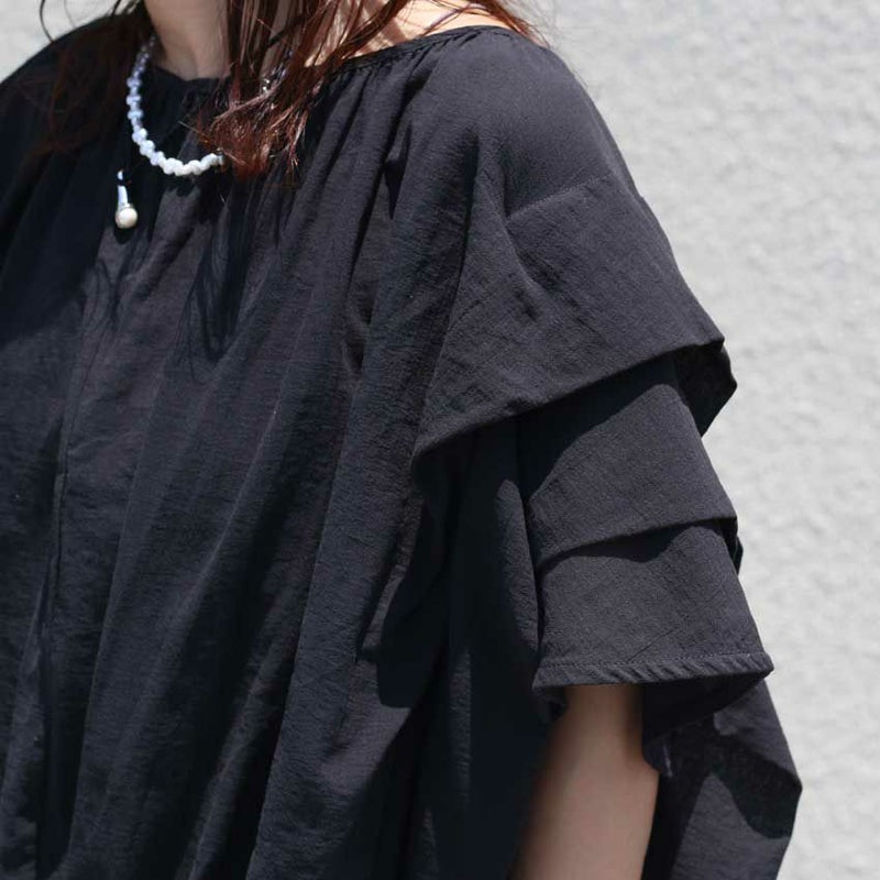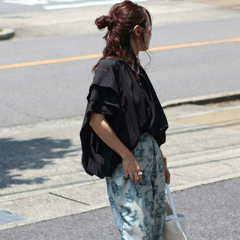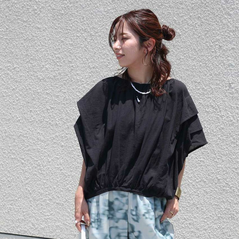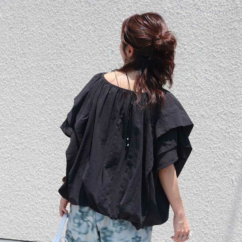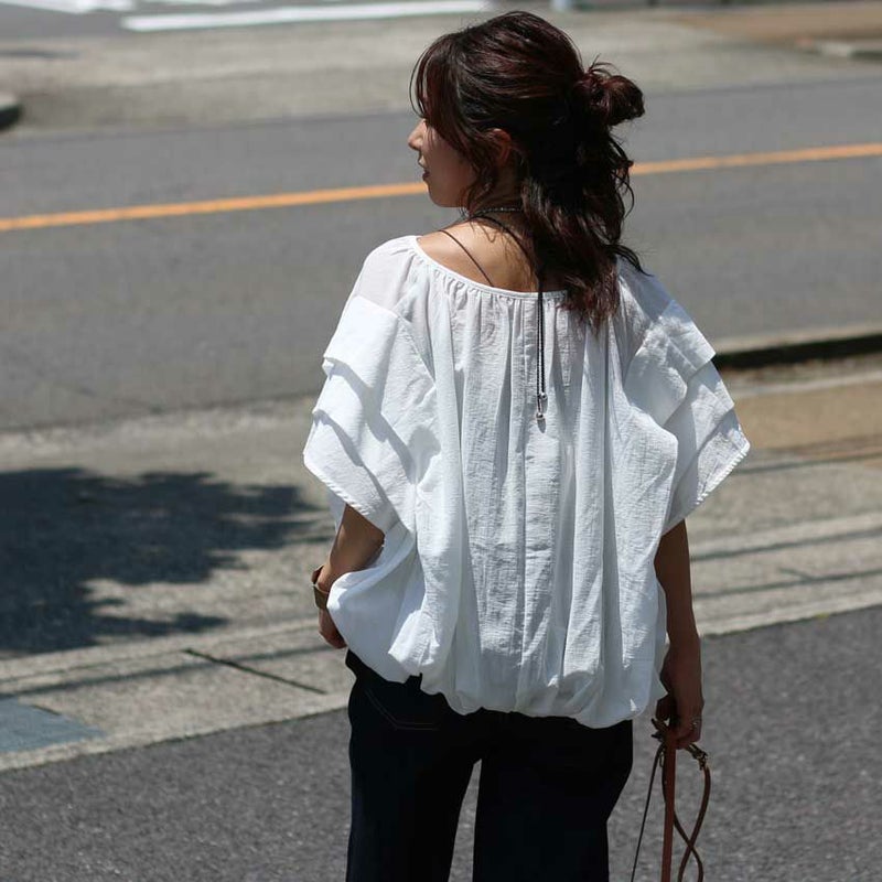 コクーン型のトレンドシルエットに、袖元の段々にあしらわれたデザインが女性らしさと二の腕カバー両方をかなえてくれるデザイントップス。