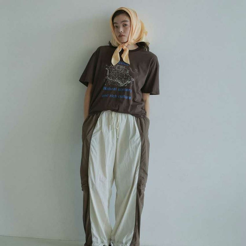 ブラウンはロゴが目立ったコントラストのある配色プリントで、シンプルな夏のスタイリングに映えます。