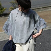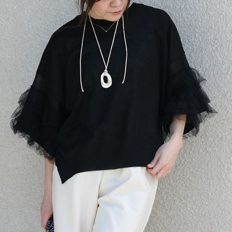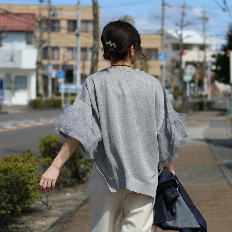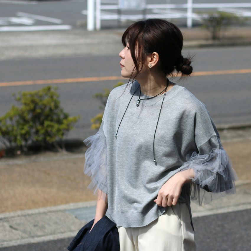 3段チュールのボリューム袖が視線を引く薄手のサマーニット。
