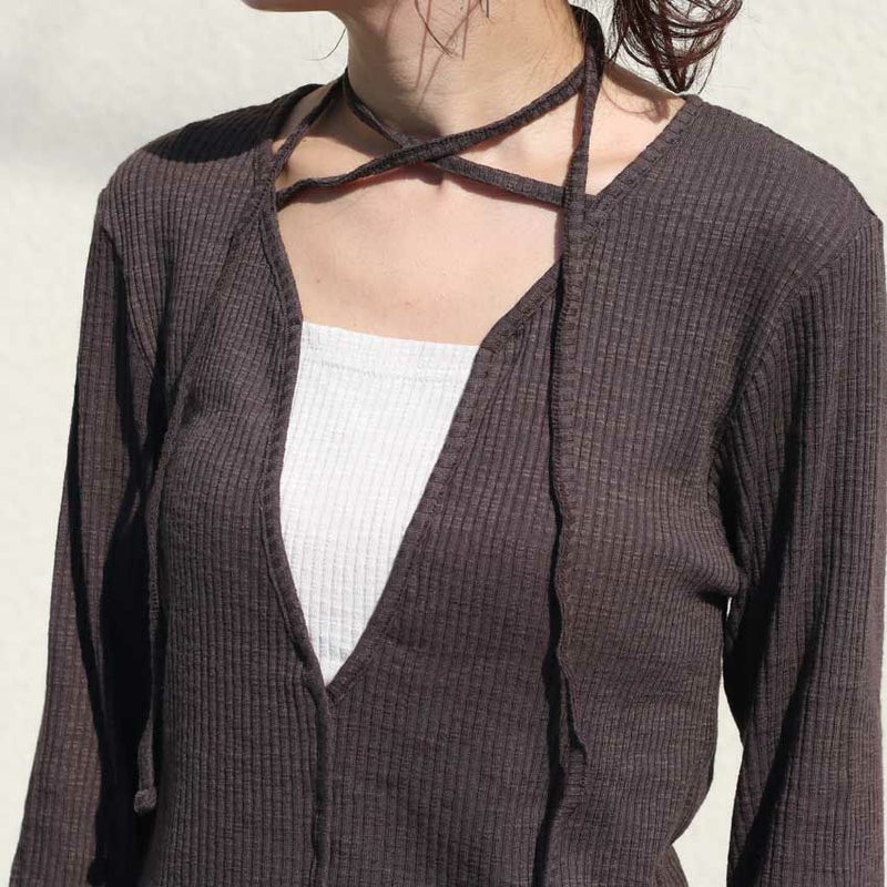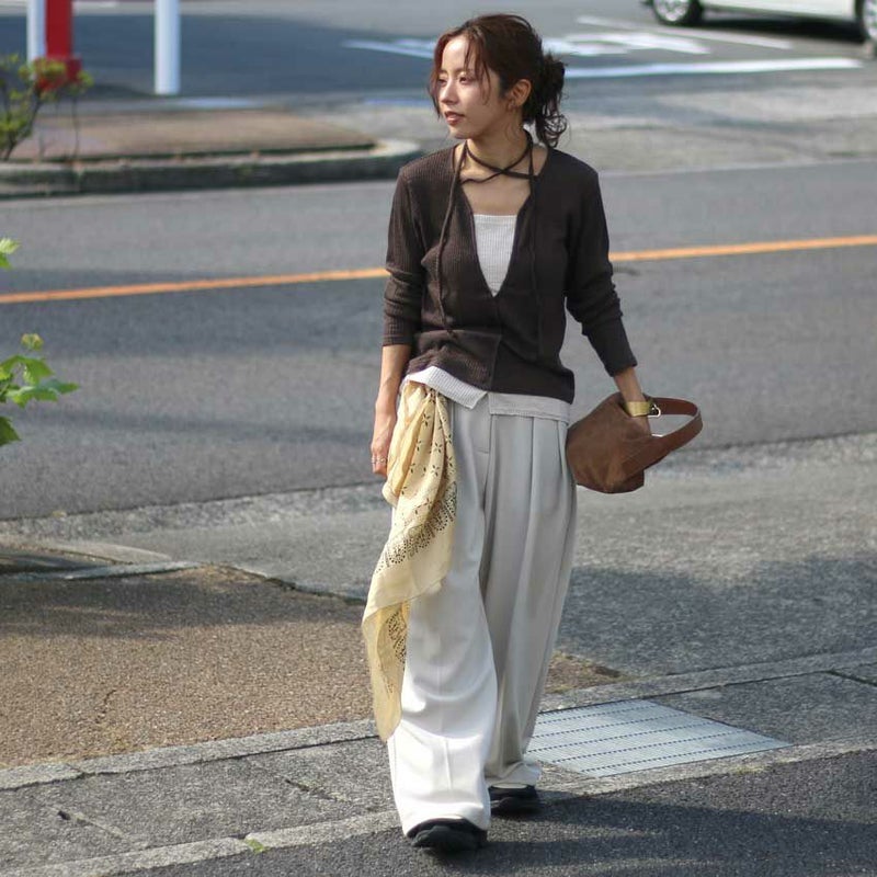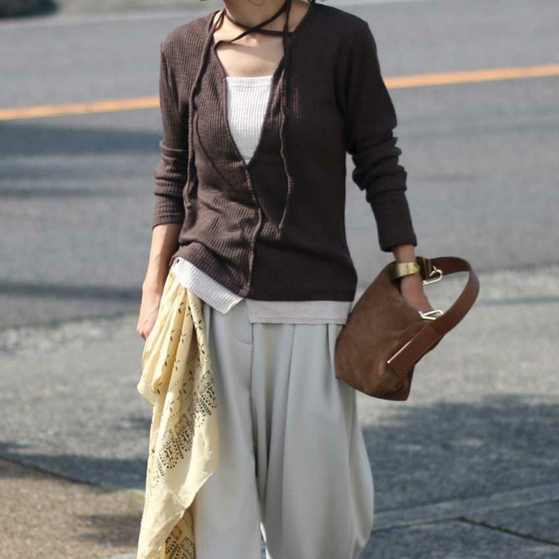 首元の紐は前に垂らしてカジュアルに、後ろで結んで上品に…アレンジ次第で印象を変えられるのも魅力です。