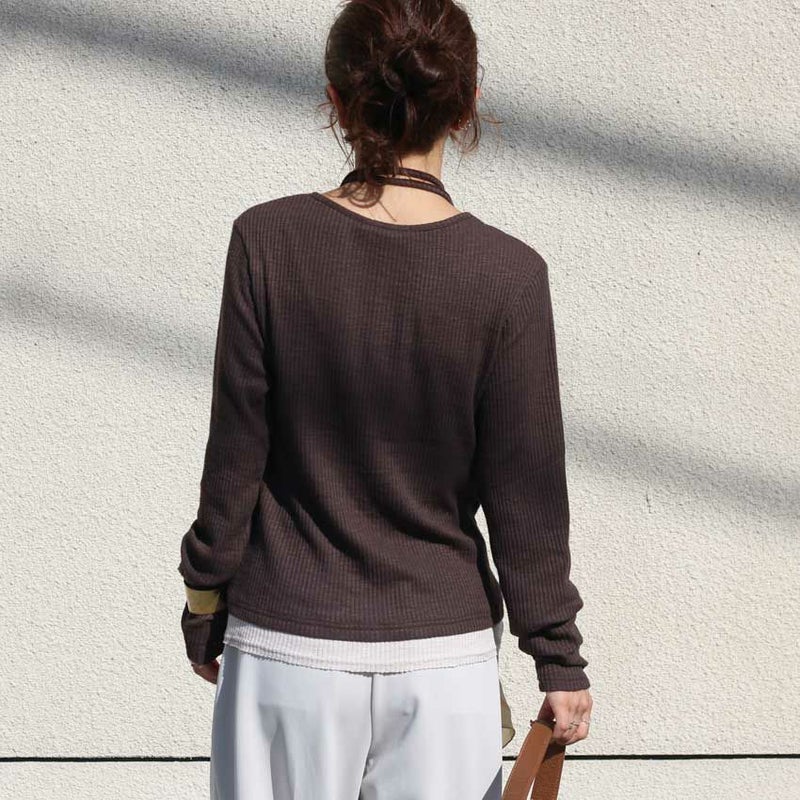 レイヤード風のデザインと絶妙な配色が目を引くプルオーバー。
