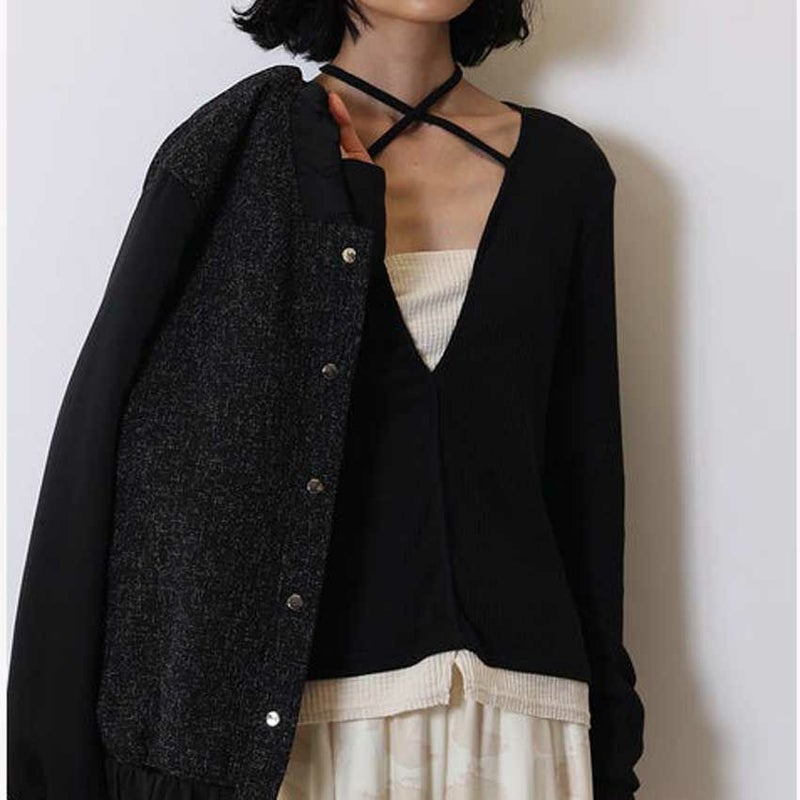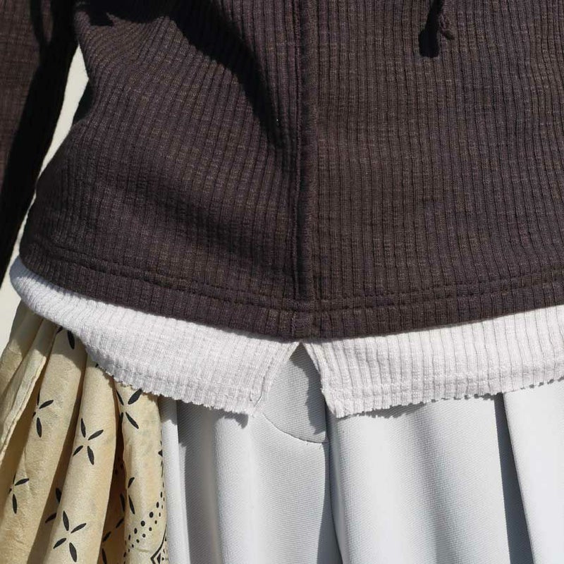 コンパクトなシルエットでも、リブ素材ならではの程よい伸縮性で動きやすく、自然に細見えを叶えます。