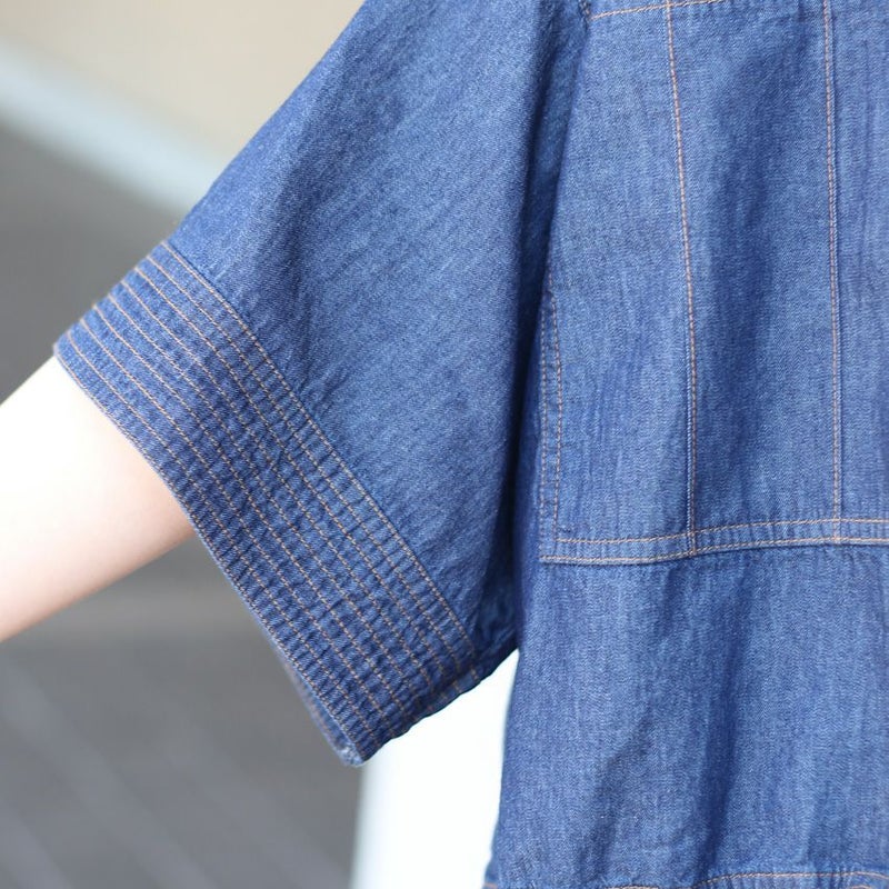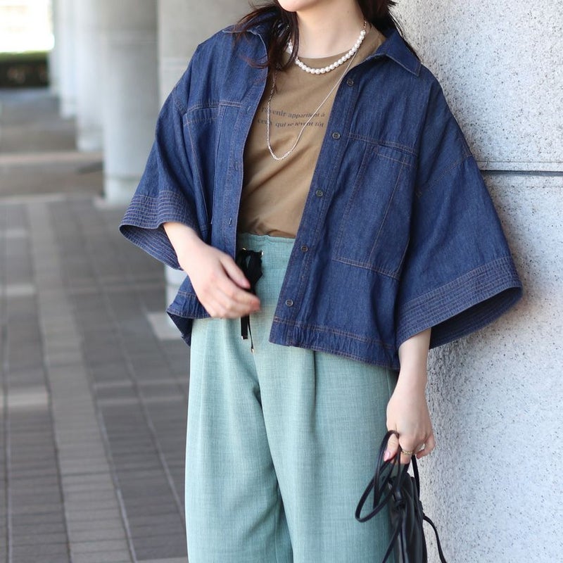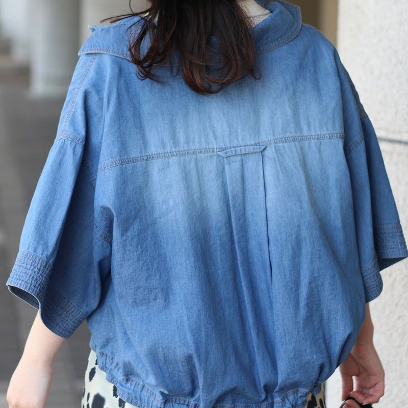 ビックスリーブの5分袖デニムブラウス。