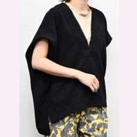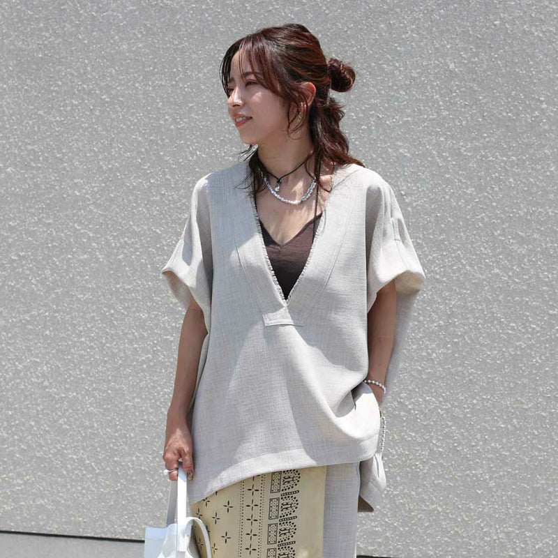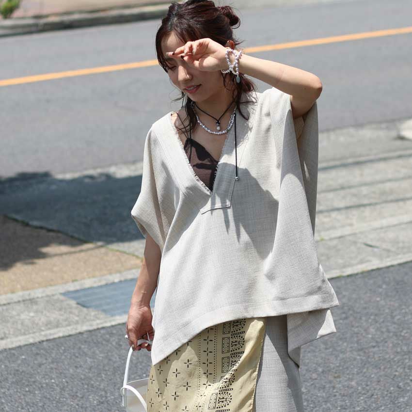 深めのVネックにフリンジを施し、顔周りをスッキリ見せます。
