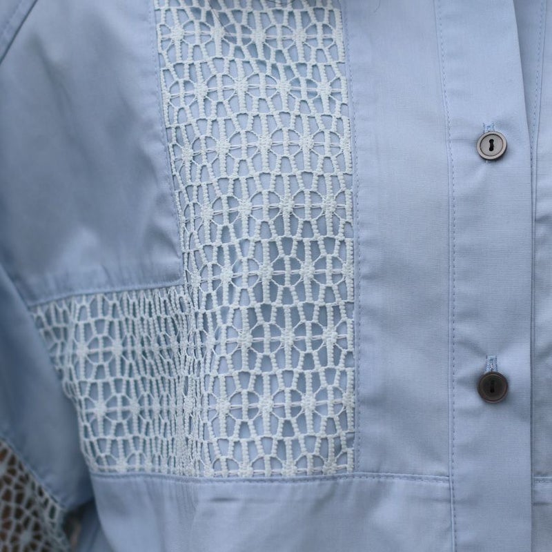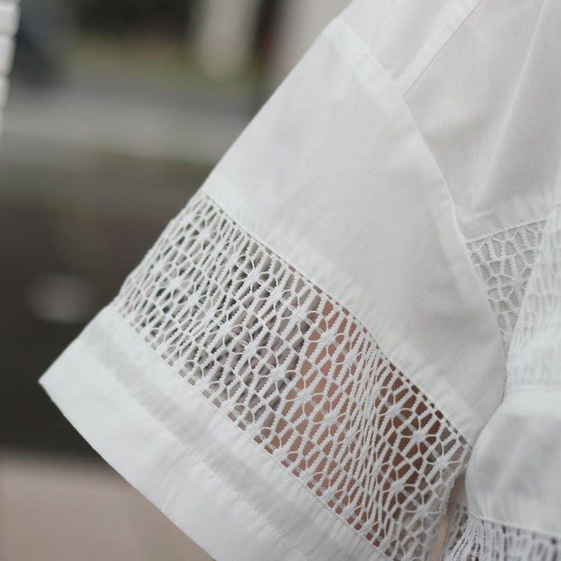 上質なブロード生地にクリスタルレースをたっぷりとあしらった、大人のためのショート丈ブラウス。