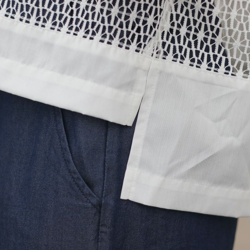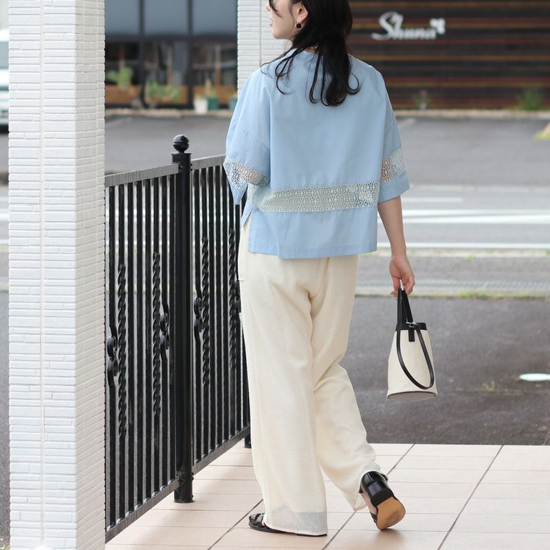 きちんと感のあるクルーネックに、控えめながら華やかさを添えるレースの透け感。