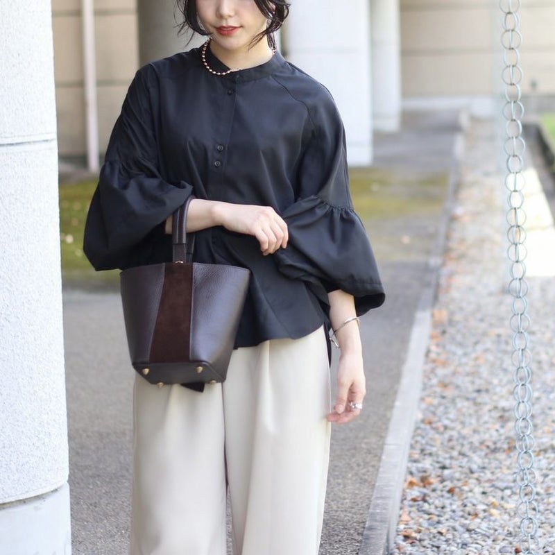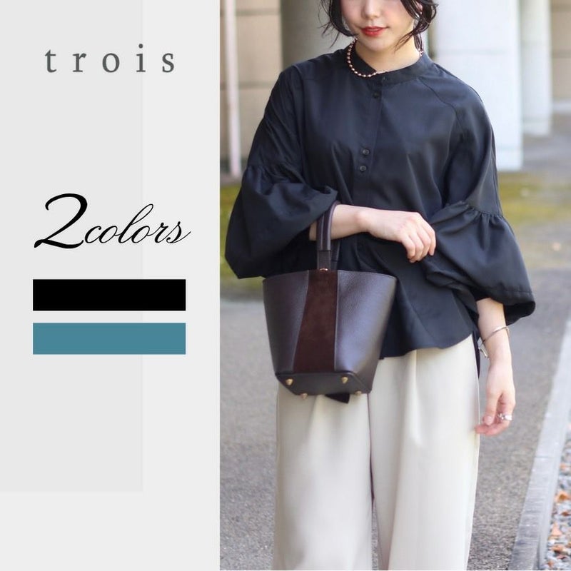trois/トロワ バルーン袖ブラウス T256-81010 スパンナナローン ノーカーラー バンドカラー パフスリーブ 袖コンシャス