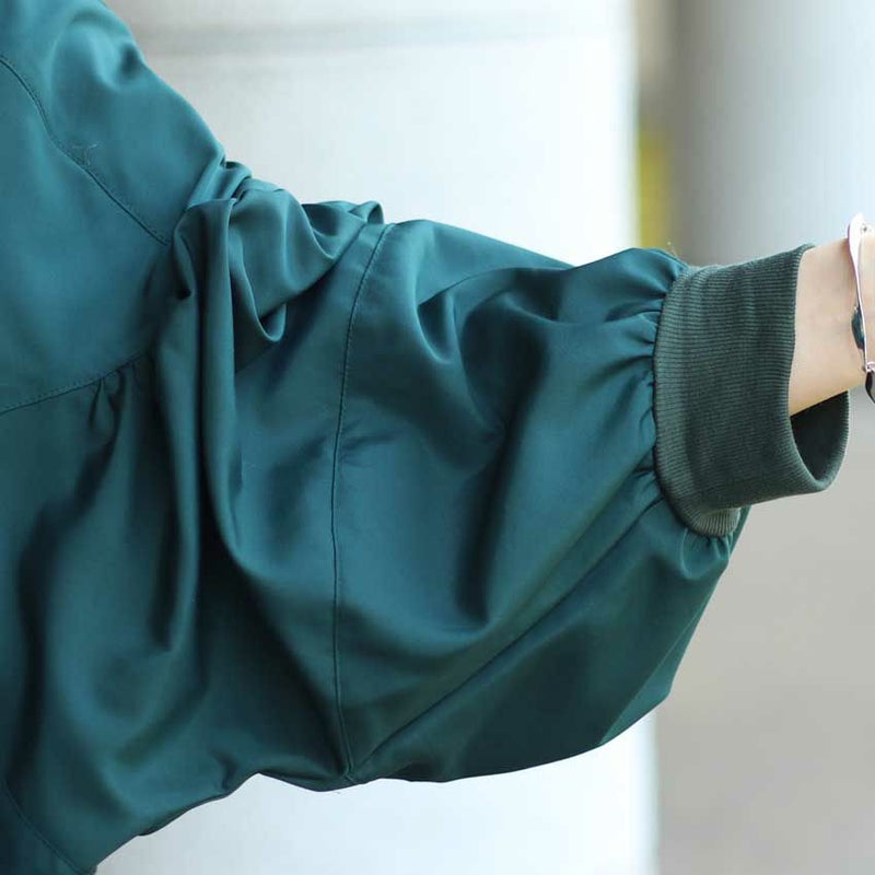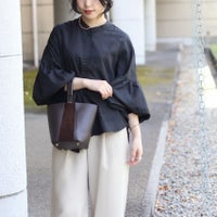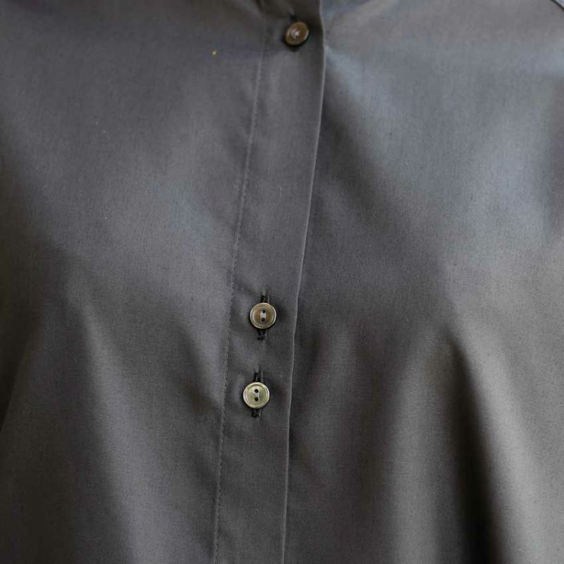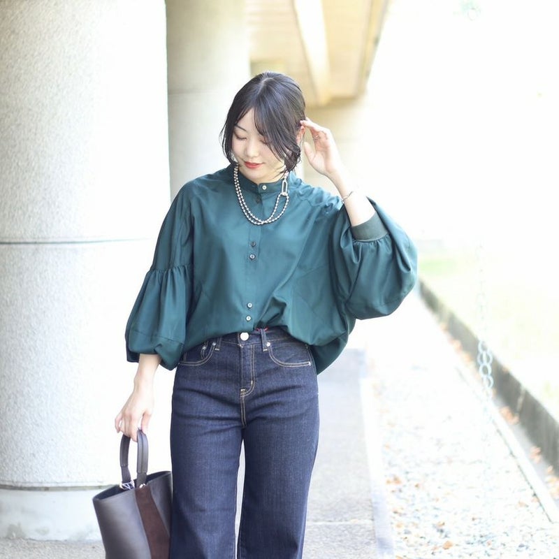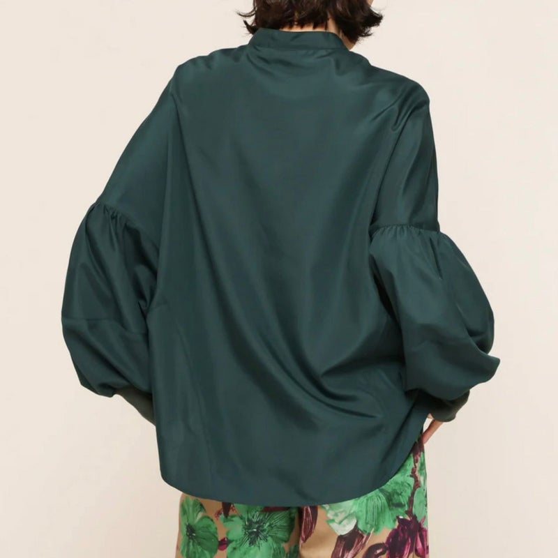 たっぷりとしたバルーン袖とアシンメトリーに配されたボタンがアクセントに。