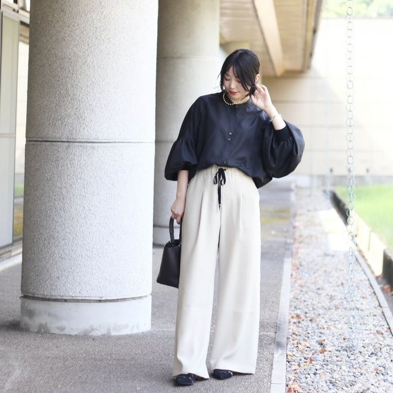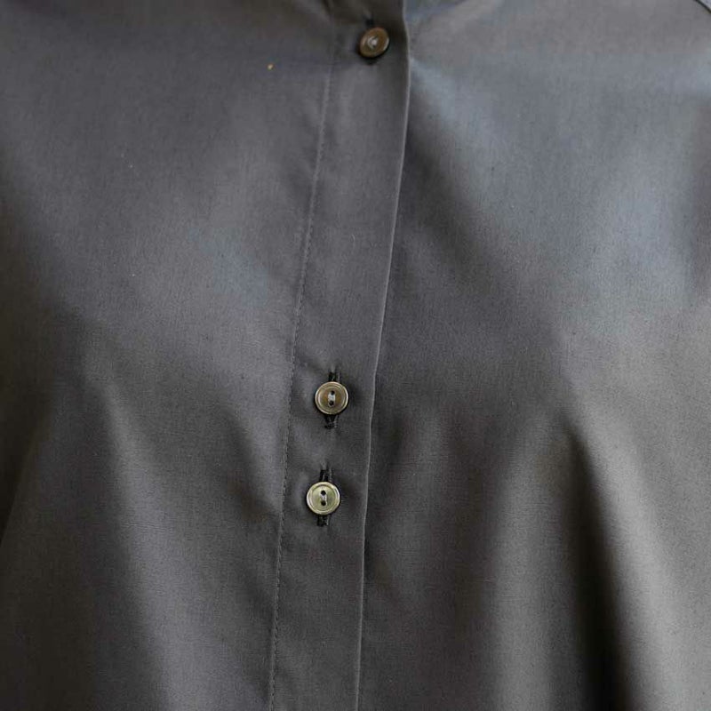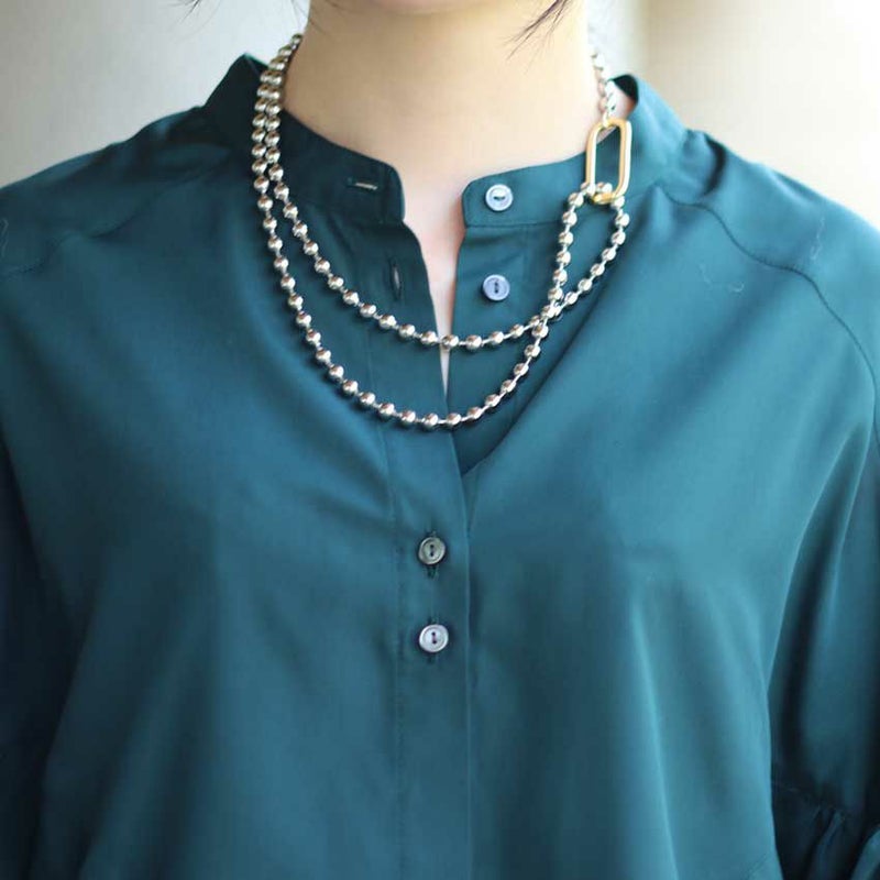 優しい肌触りと美しいドレープ性を兼ね備えた天然タッチ素材のバンドカラーブラウス。