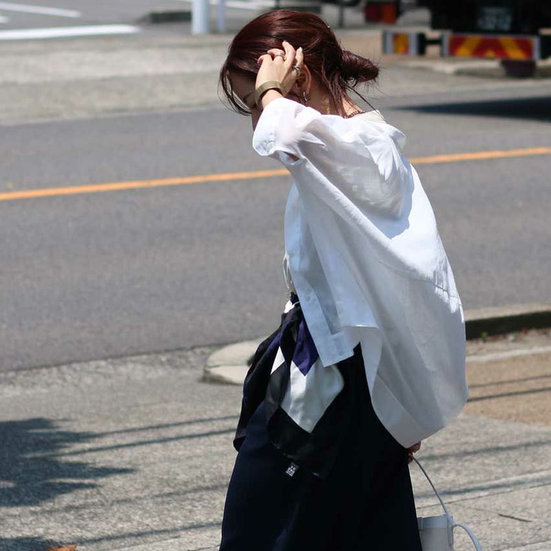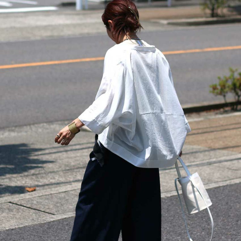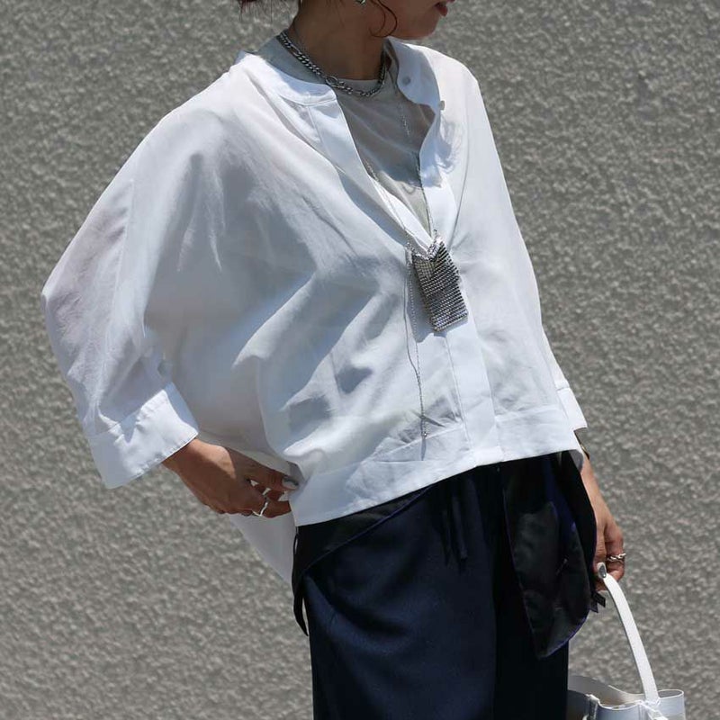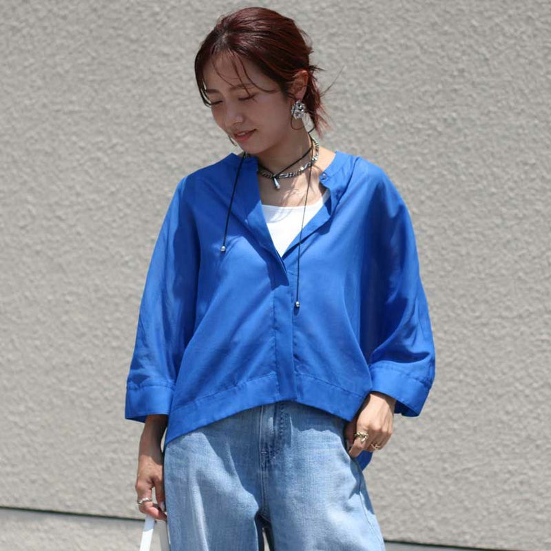 風通しのいいドルマンスリーブと、首元をすっきり見せるバンドカラーで、品のあるカジュアルスタイルが完成。