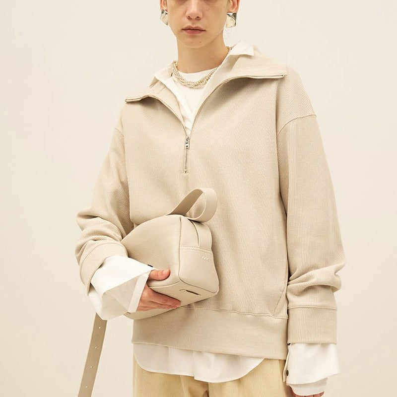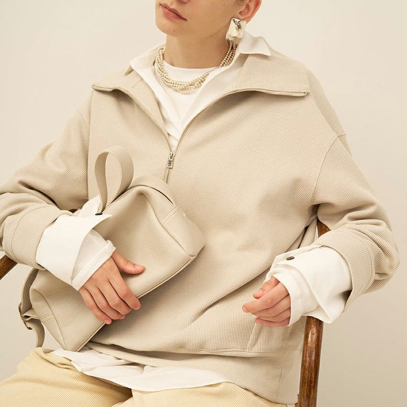 大きめの衿と深めのジップ開きにすることで、インナー次第で印象がチェンジできる一枚です。