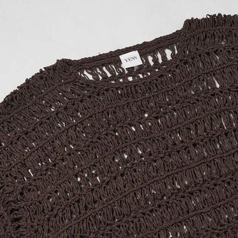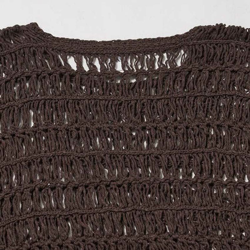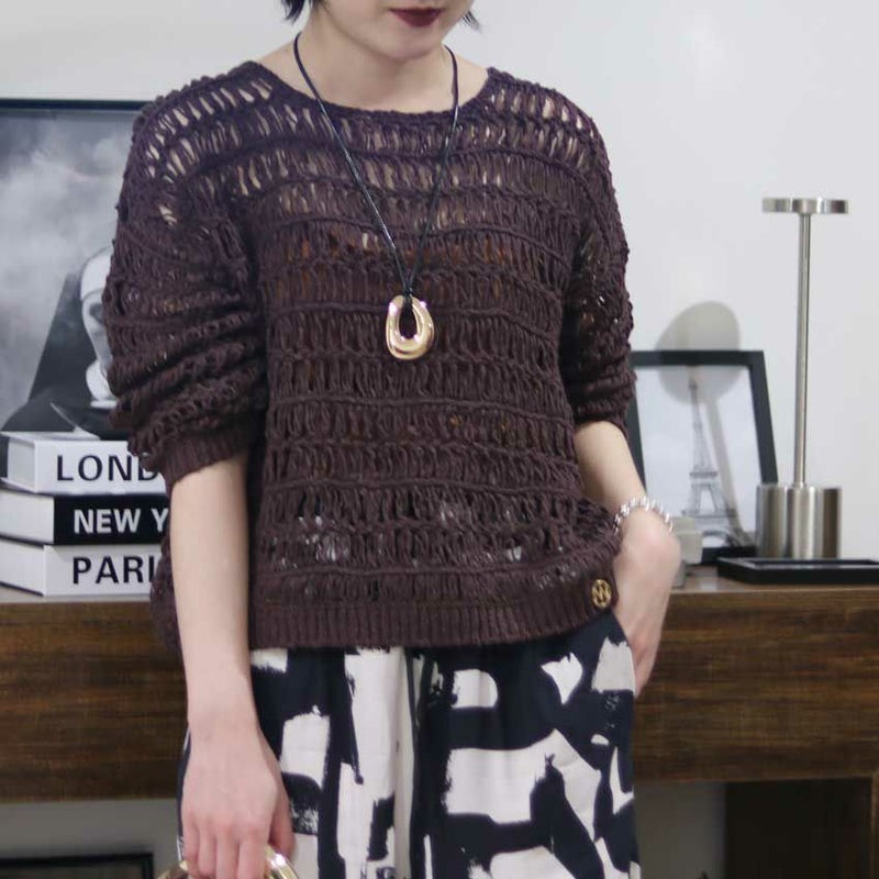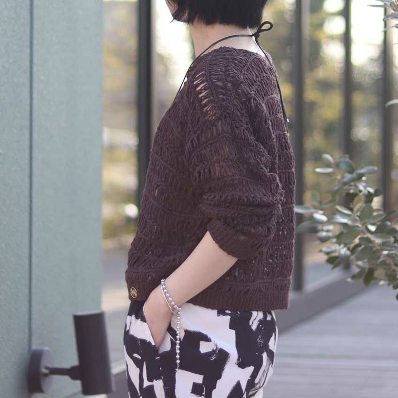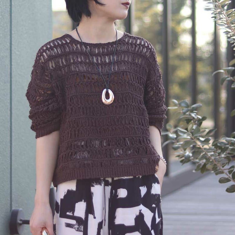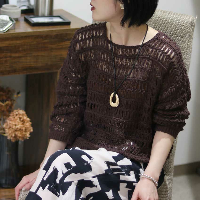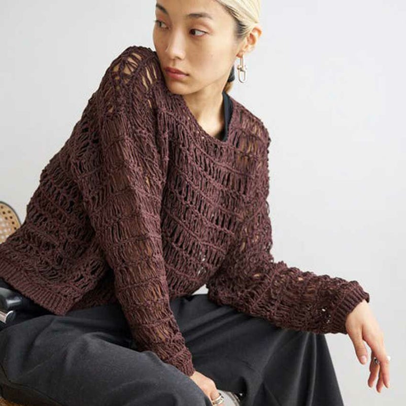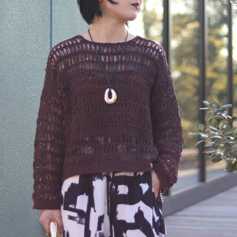 機械編みのパーツを、かぎ針編みで繋ぎ合わせる手の込んだ透かし柄で、ボヘミアンムード漂うニットプルオーバー。
