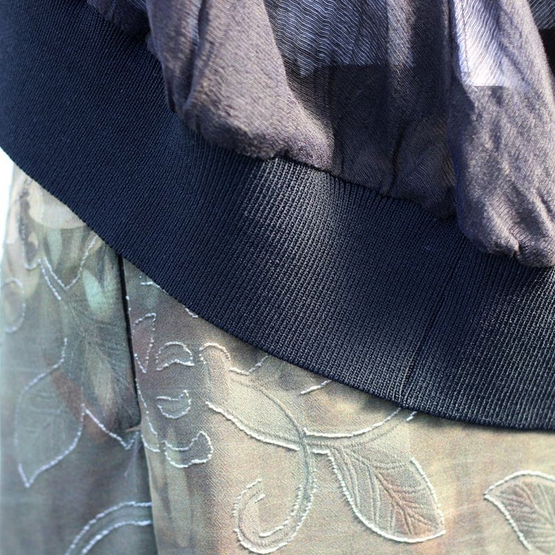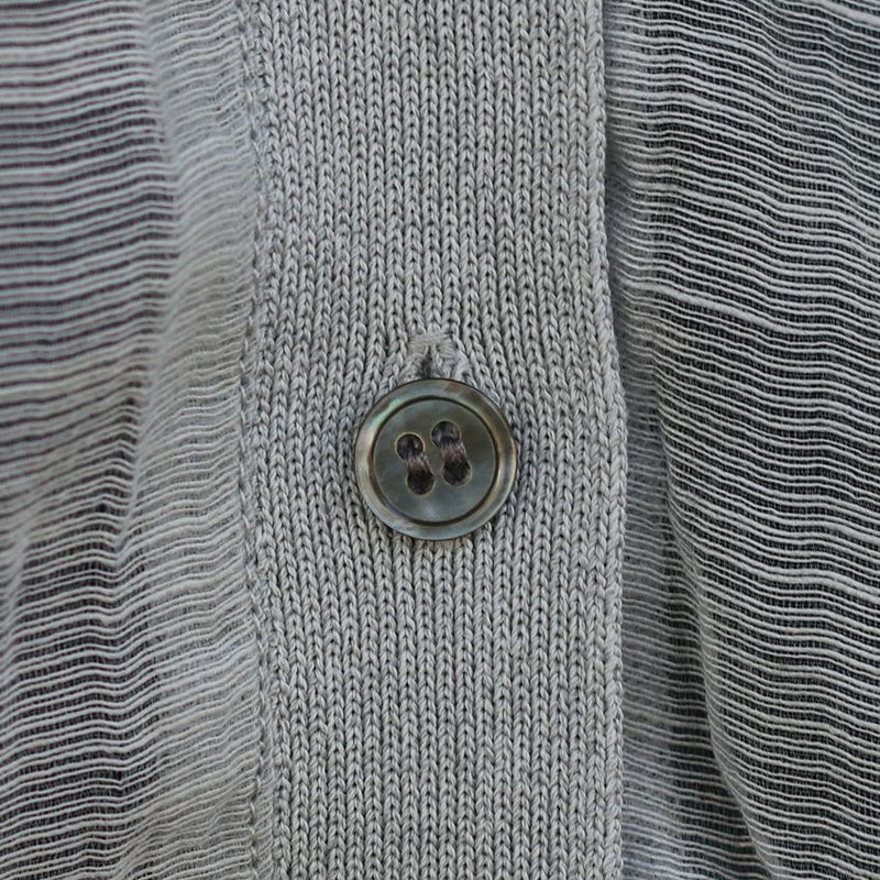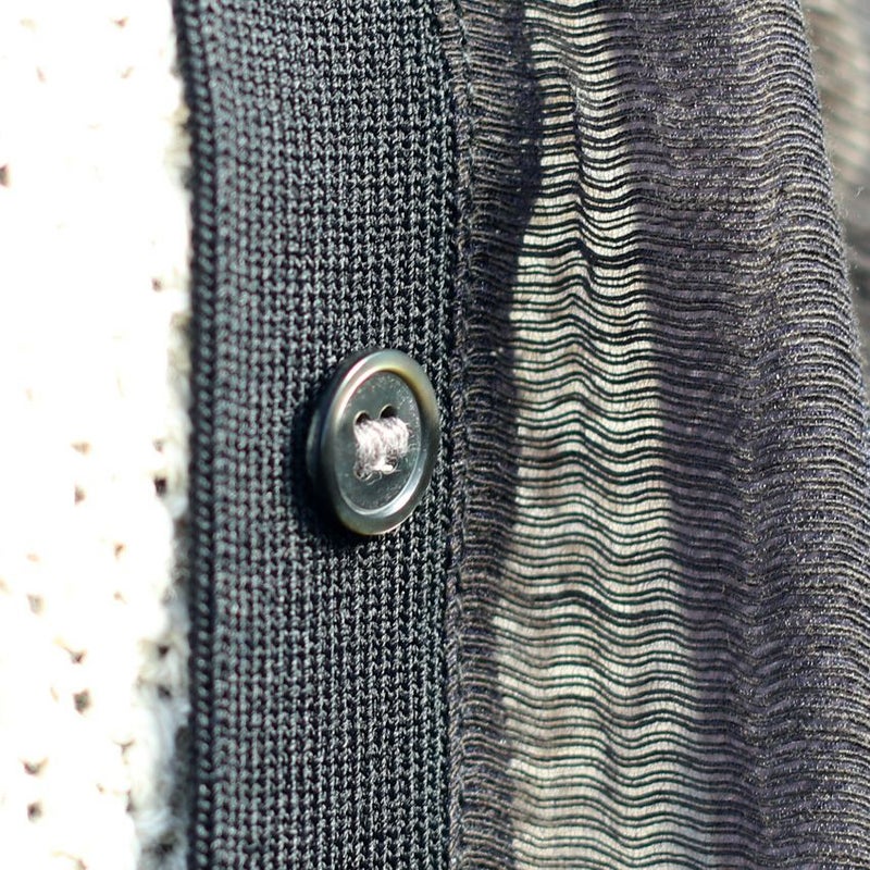 前立て、袖、裾口にニット付属を使った布帛のカーディガン。