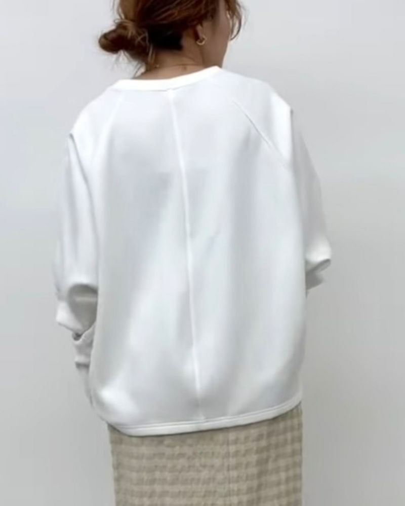 ゆるやかに前後差のあるデザインに、ゆったりめのドルマンシルエットが女性らしい一着です。