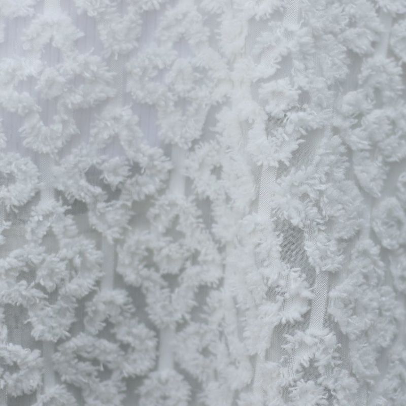 透け感のあるポリエステル生地に、ふんわりと立体感のあるフラワーモチーフを織り込んだ特別な一枚です。