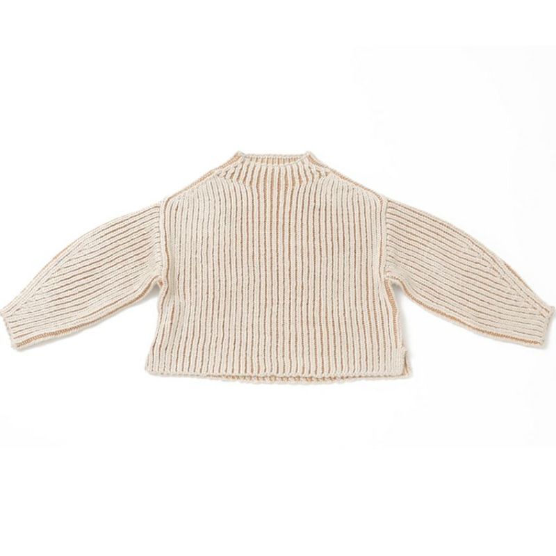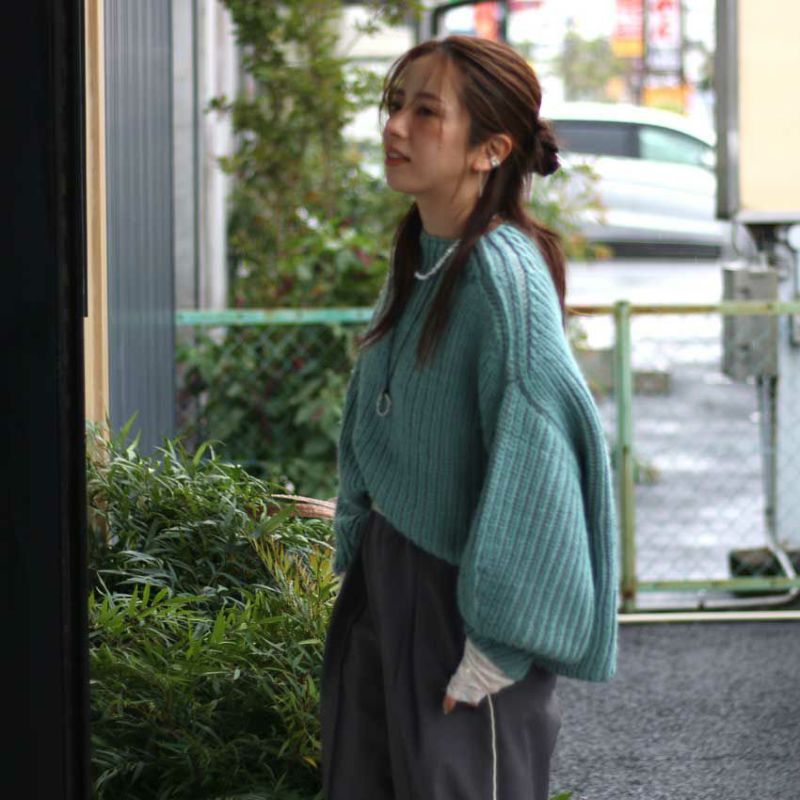 すっきりとした抜け感を演出しつつ、首元をやさしく包み込むバランスが絶妙です。袖は先端に向かって自然にテーパードするよう編み地を調整し、全体のシルエットにメリハリをプラス。身頃はレイヤードを楽しめるワイドシルエットで、シャツやロンTとの重ね着にも相性抜群です。