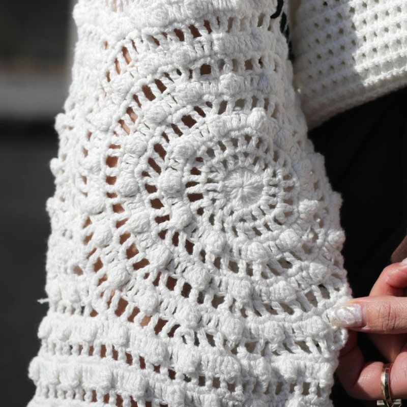 しっかりと編みこんだメッシュのハリと存在感のある袖のモチーフが優しくなりがちな”かぎ針編み”にモードな印象をプラス。