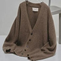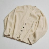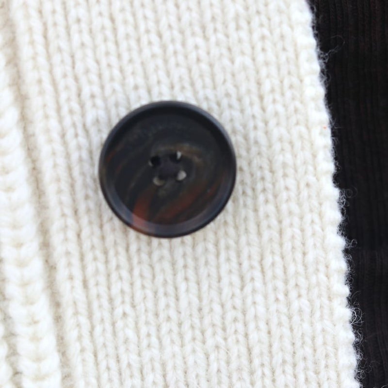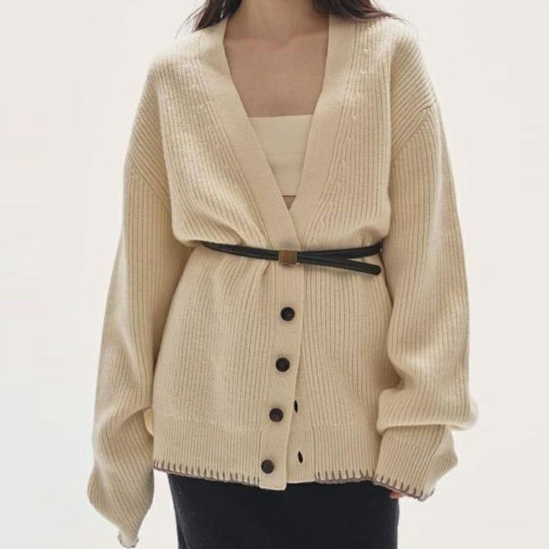 ラムウール混の糸で編み上げたリブニットカーディガン。