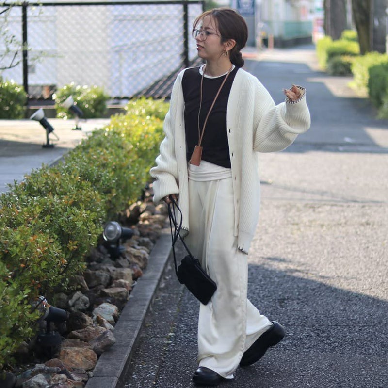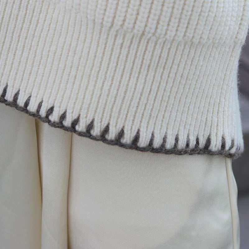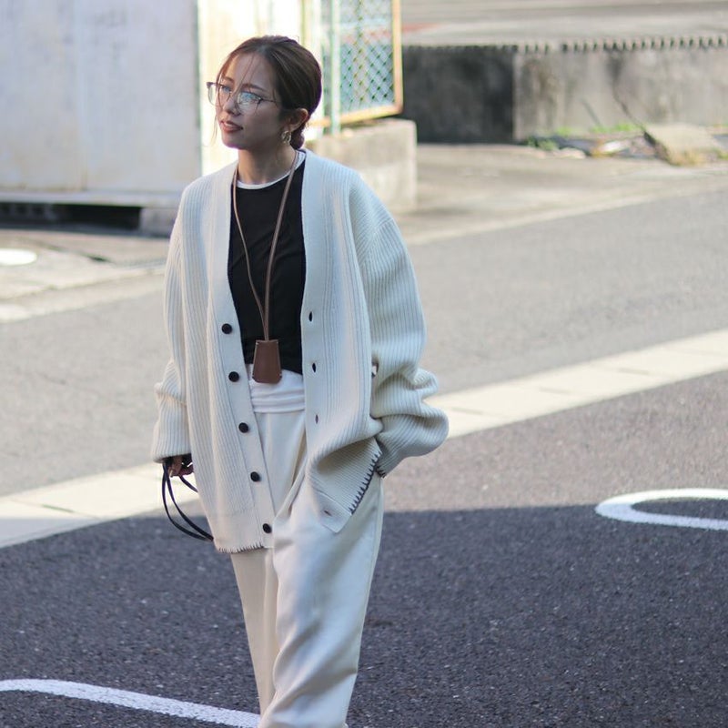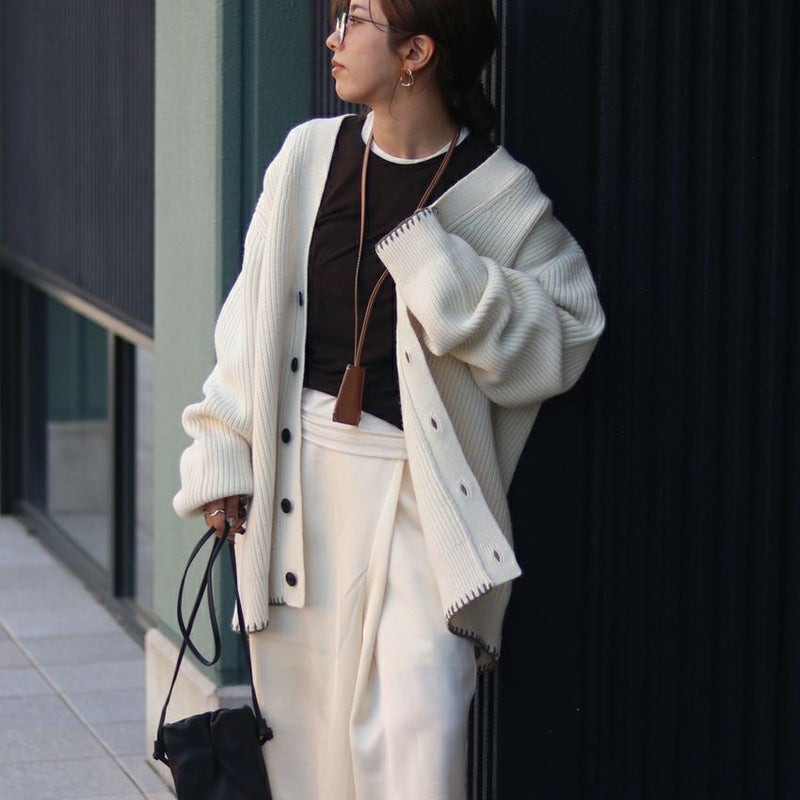 程良く厚みのある編地が立体的なシルエットを生み、身体を包み込むような柔らかさも魅力。袖口と裾にあしらった繊細なハンドステッチが、控えめながらも印象的なアクセントに。