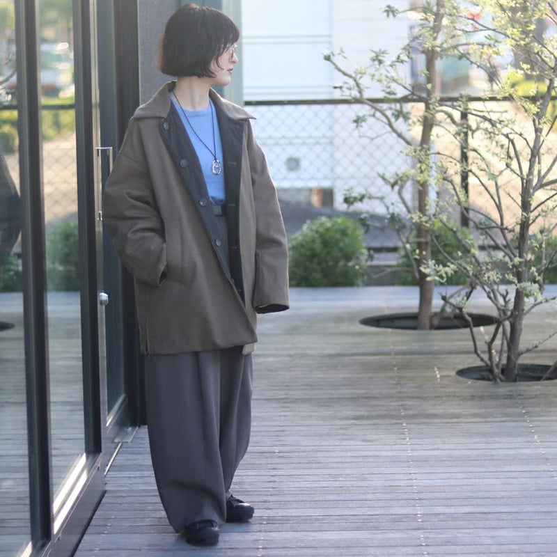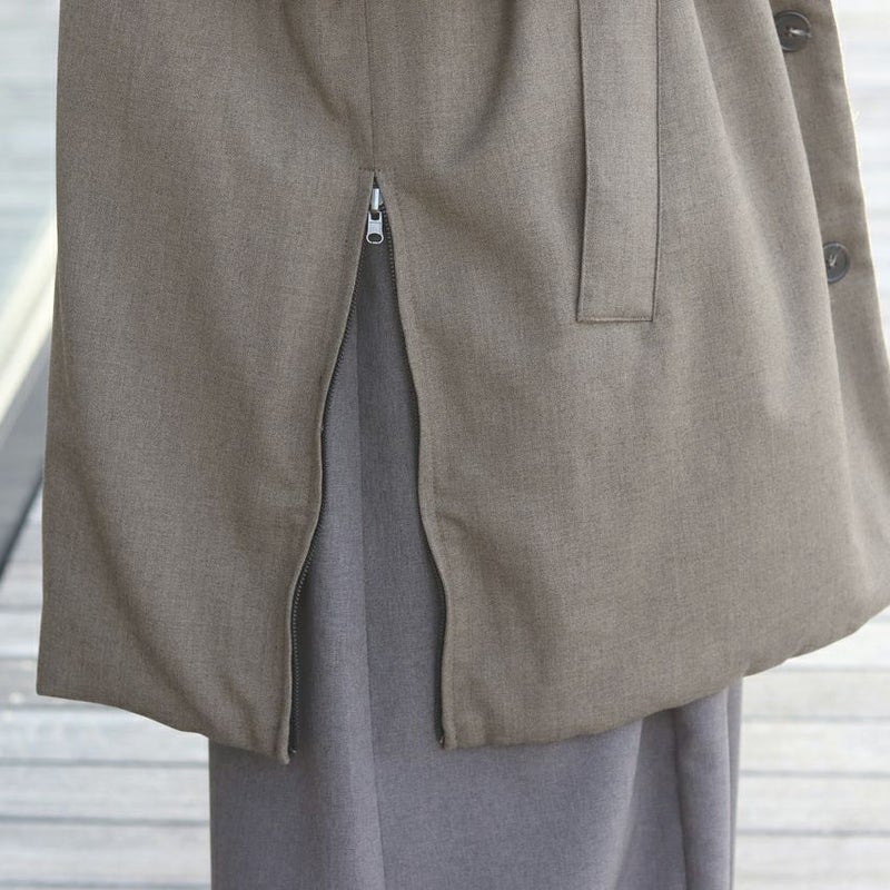 両脇裾にはジップ付きスリットを配し、開けて着ることで抜け感をプラス。