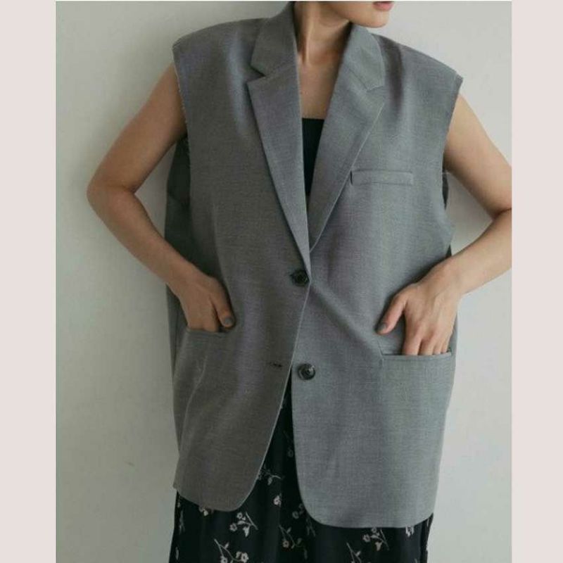 平織りのヘザー素材で仕上げたオーバーベスト。