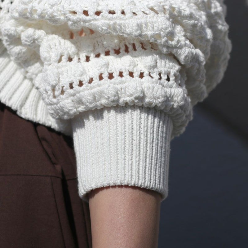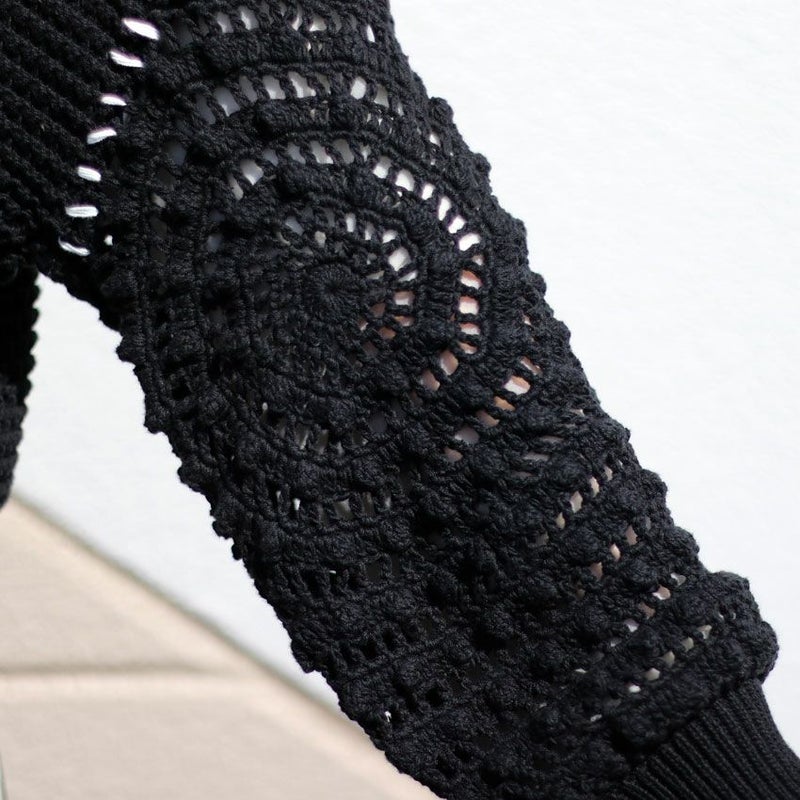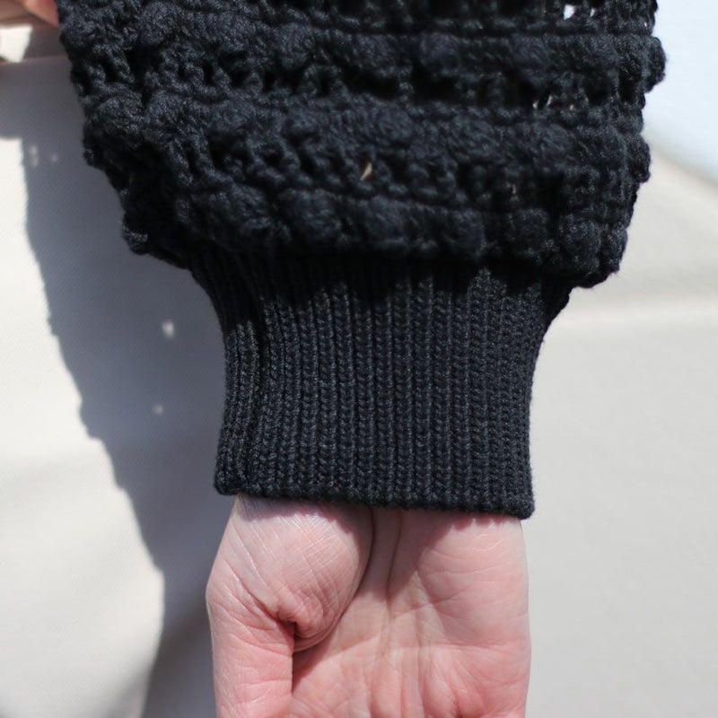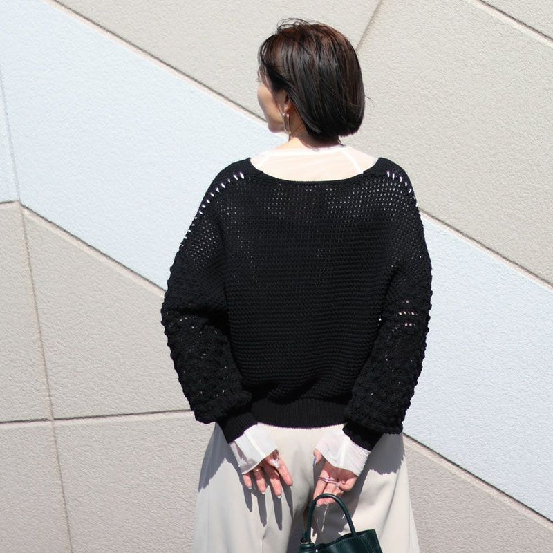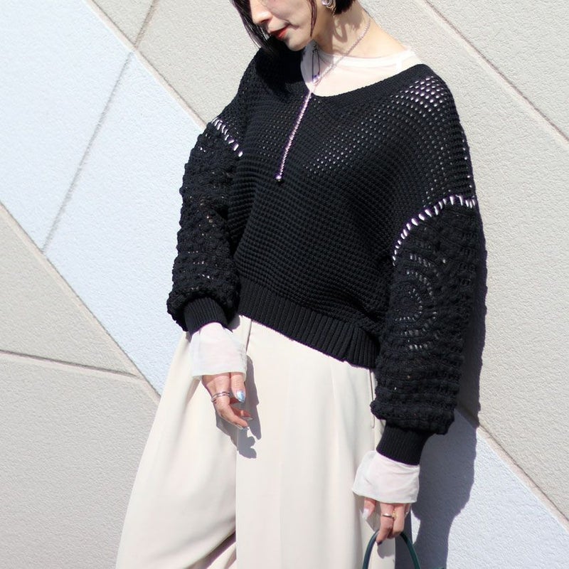 しっかりと編みこんだメッシュのハリと存在感のある袖のモチーフが優しくなりがちな”かぎ針編み”にモードな印象をプラス。