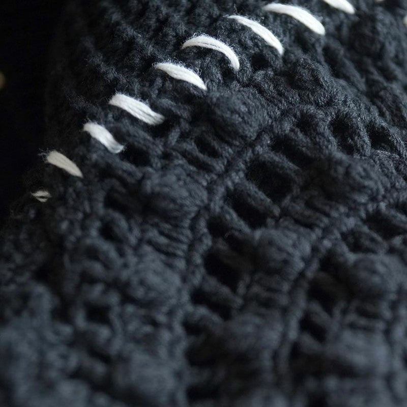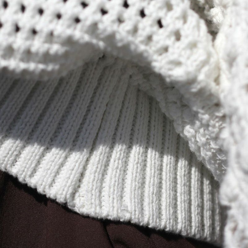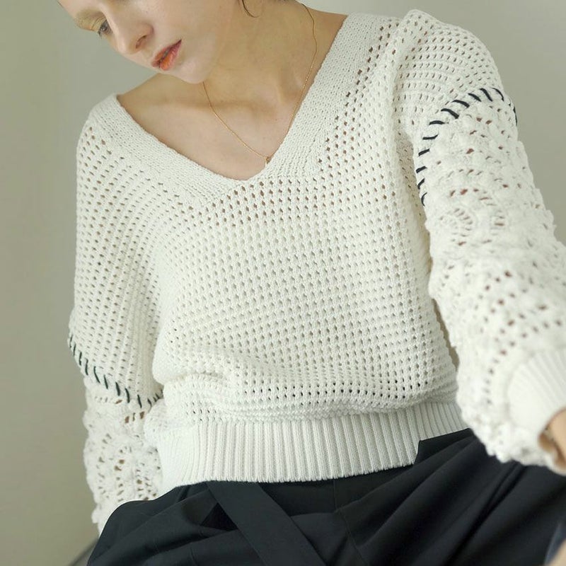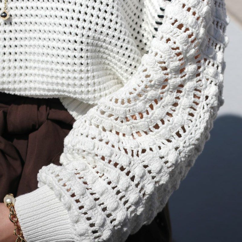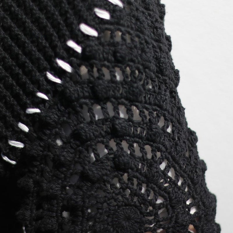 しっかりと編みこんだメッシュのハリと存在感のある袖のモチーフが優しくなりがちな”かぎ針編み”にモードな印象をプラス。