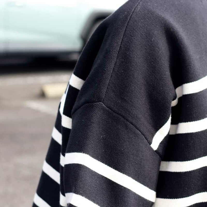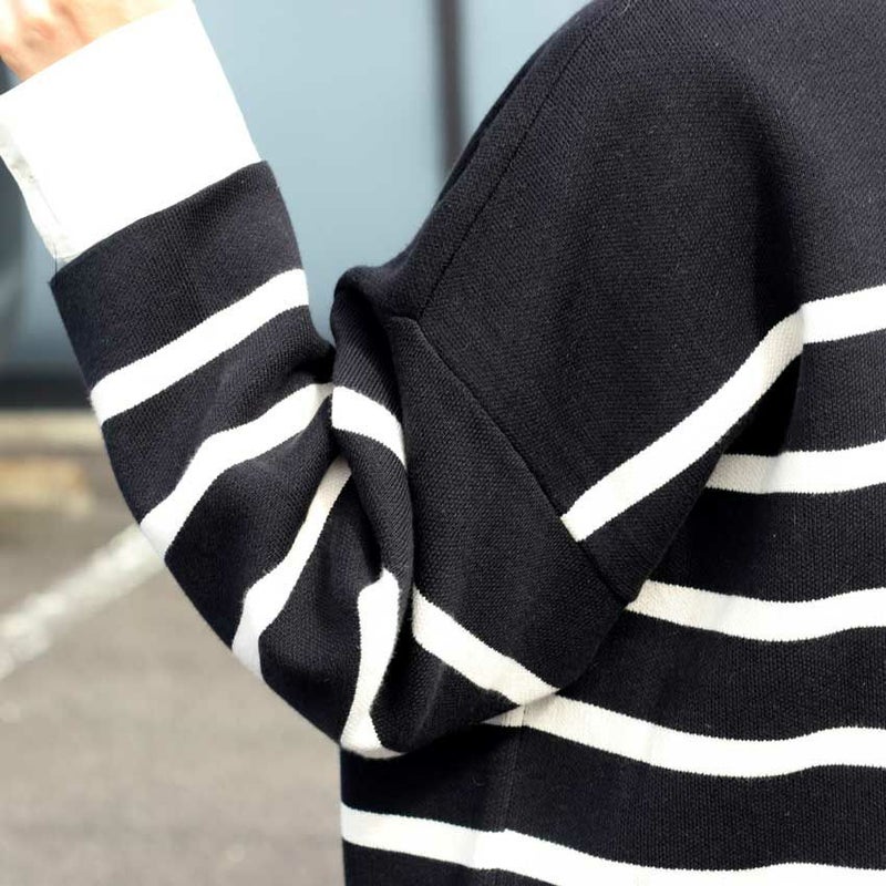 注目は、ボーダーのリズムを崩さず配置されたブランドロゴパッチ。