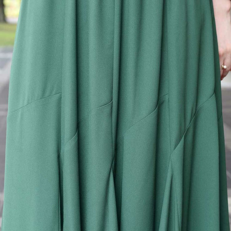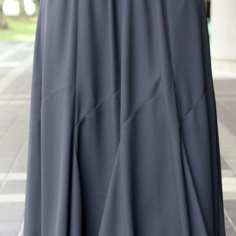 切替えデザインが美しいマーメイドシルエットを描き出し、歩くたびに優雅な揺れ感を演出します。