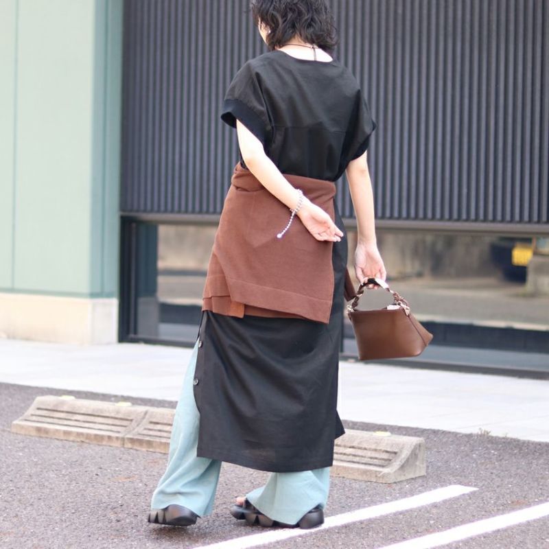 サイドボタンを留めてワンピースとしてすっきり着るのはもちろん、ボタンを開けてパンツと合わせれば、抜け感のあるカジュアルスタイルに。